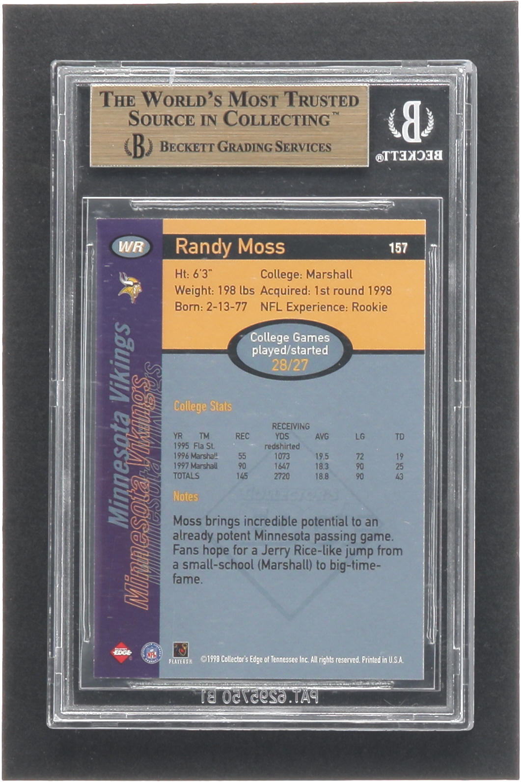 Randy Moss 1998 Collector's Edge First Place Record Setters #157B RC (BGS 9.5)