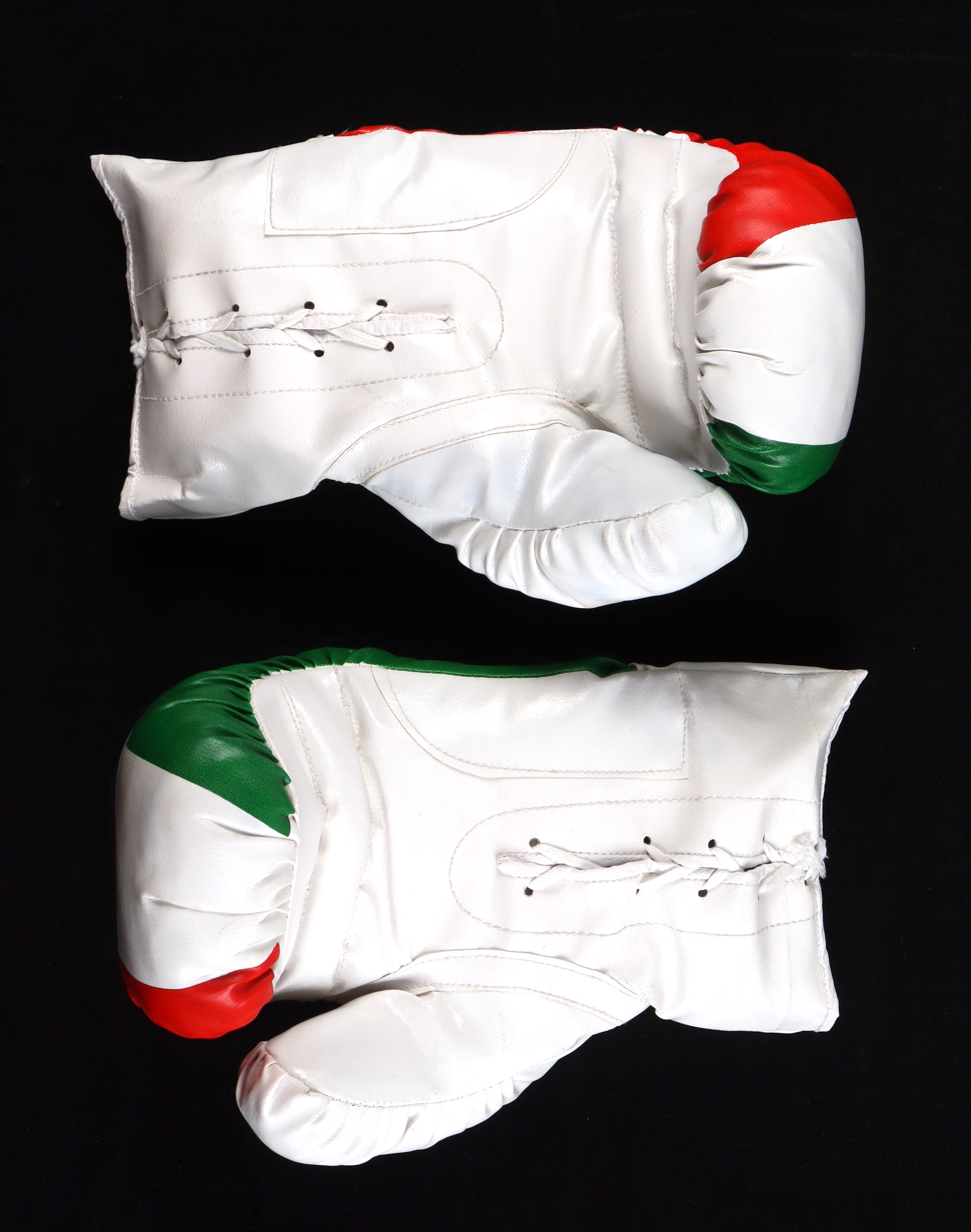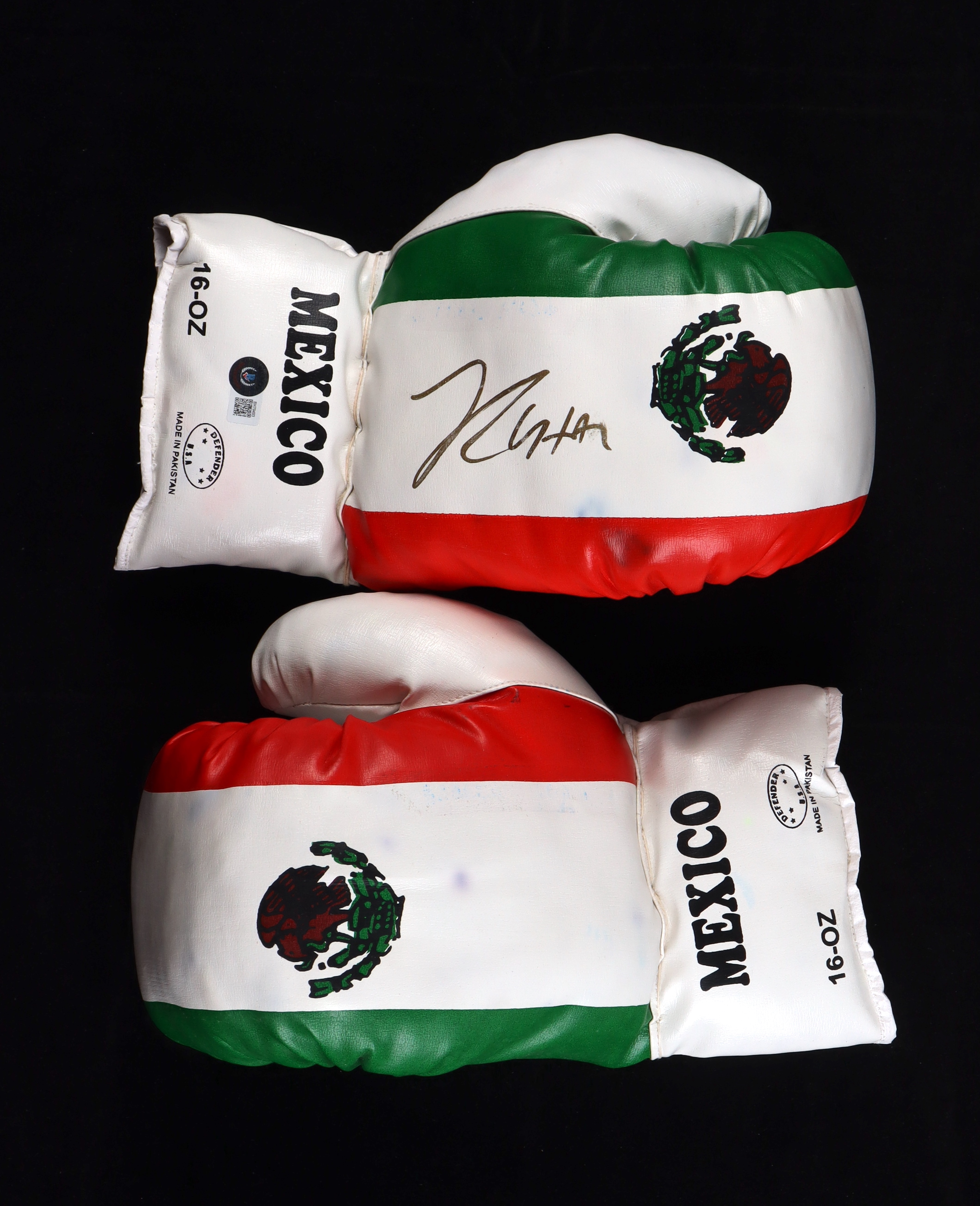 Mexico National boxing gloves. Right glove is hand-signed by Julio Cesar Chavez (HOF). Please note, gloves have stains and signature has smudged. Refer to photos for condition of the gloves.