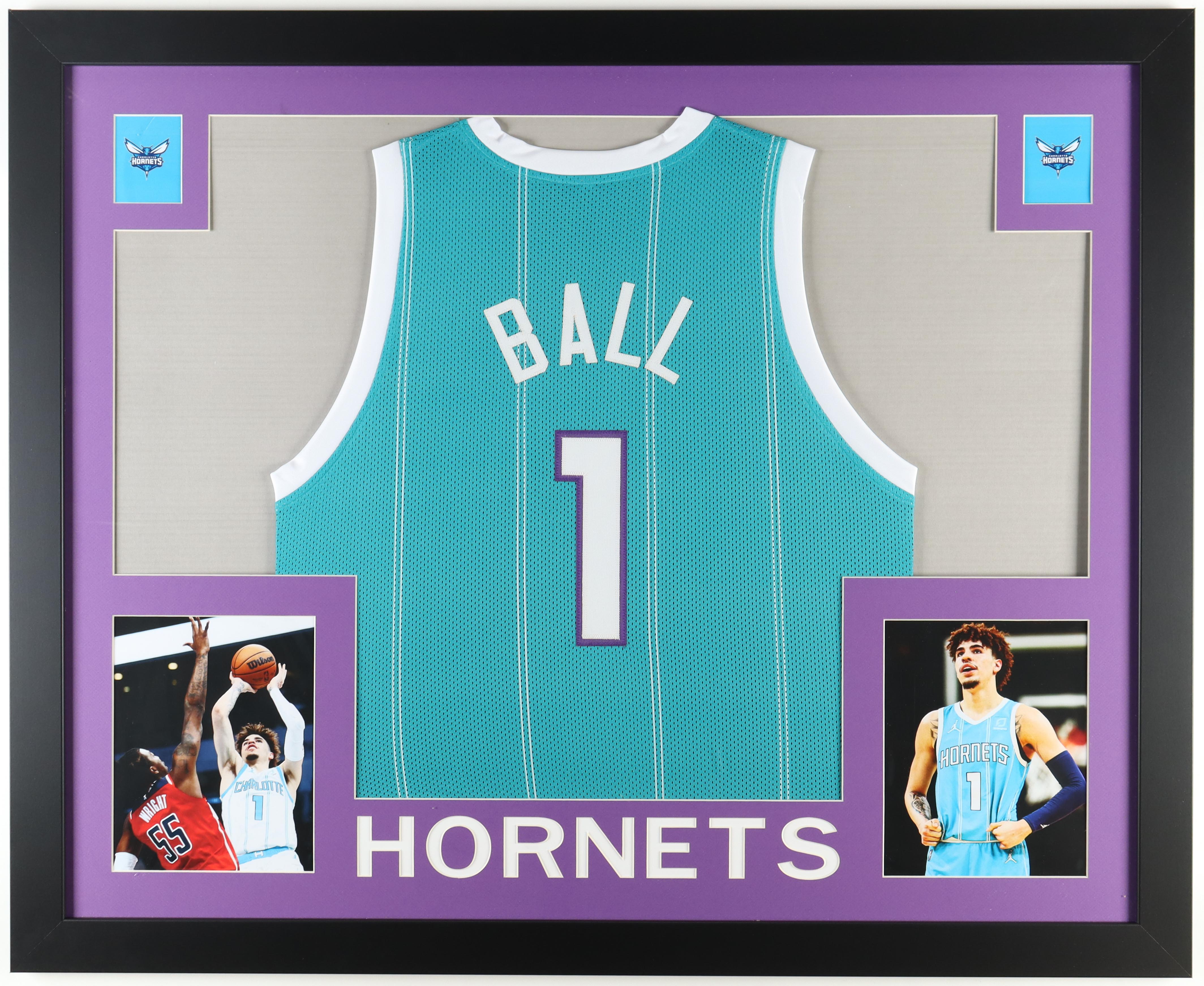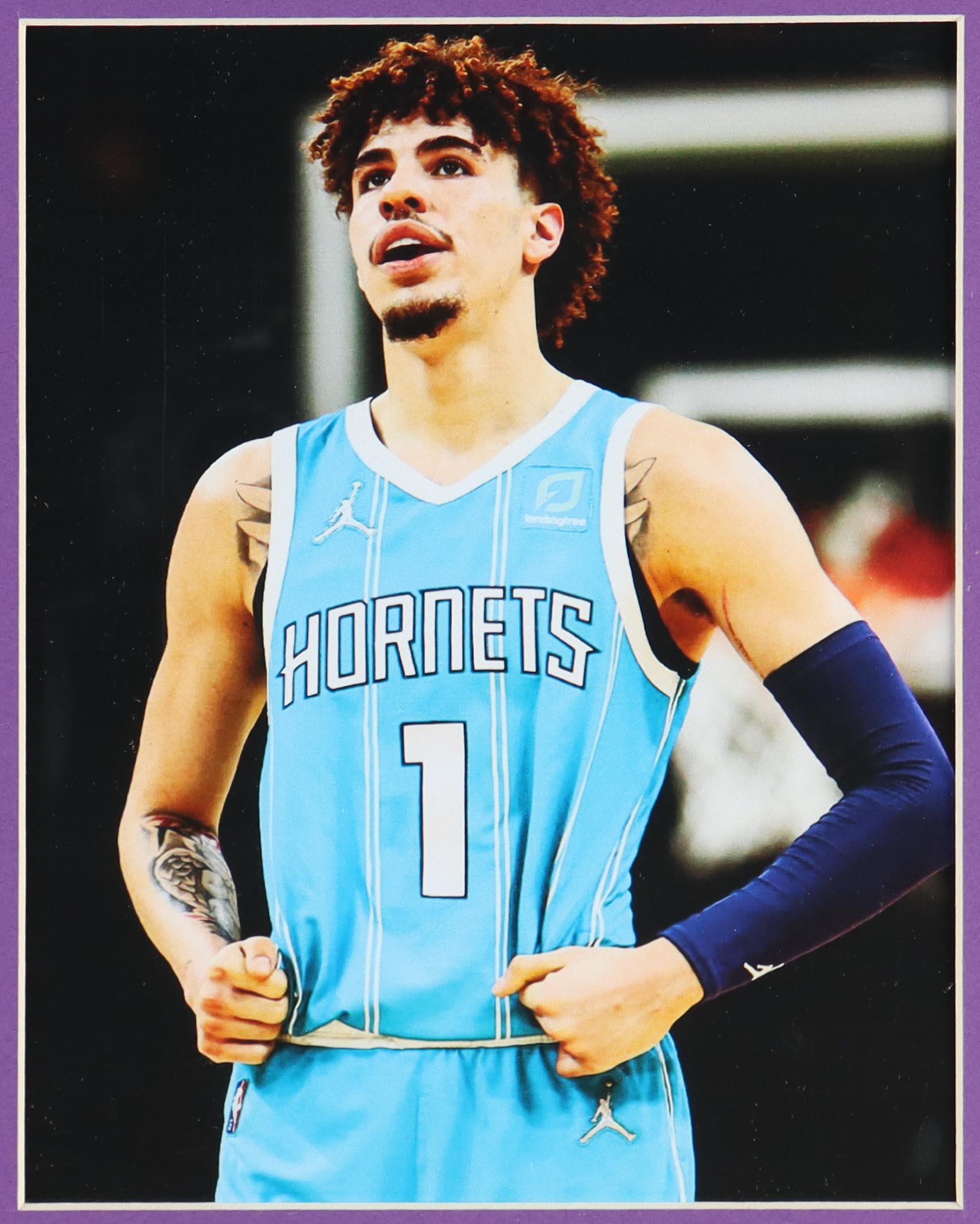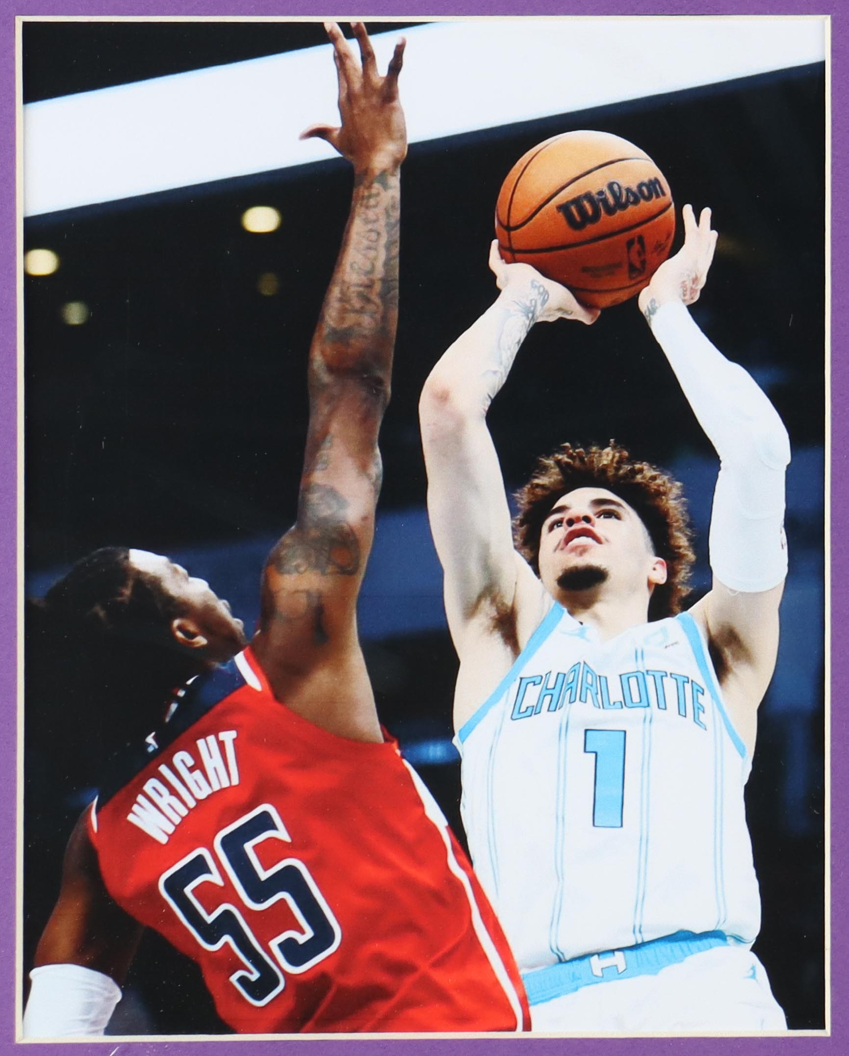 Custom frame measures 35" x 43" in size and features a LaMelo Ball jersey. Display also features (2) 8" x 10" photos. Please note, display is unsigned.