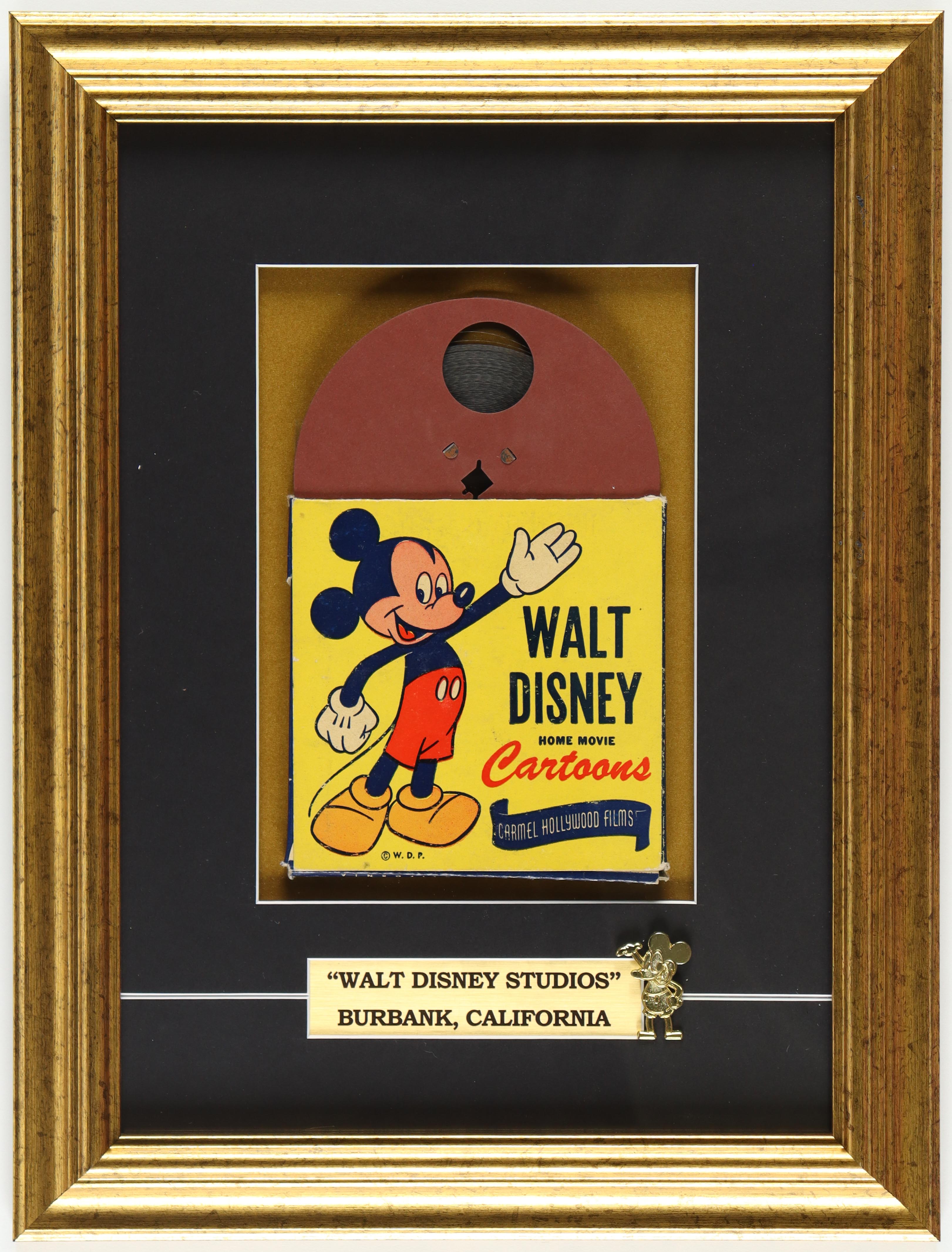 Custom Frame measures approximately 13" x 17 in size. The display features "Walt Disney Home Movie Cartoons" 8mm Film Reel. The display also includes a Gold Platted Mickey Mouse Pin.