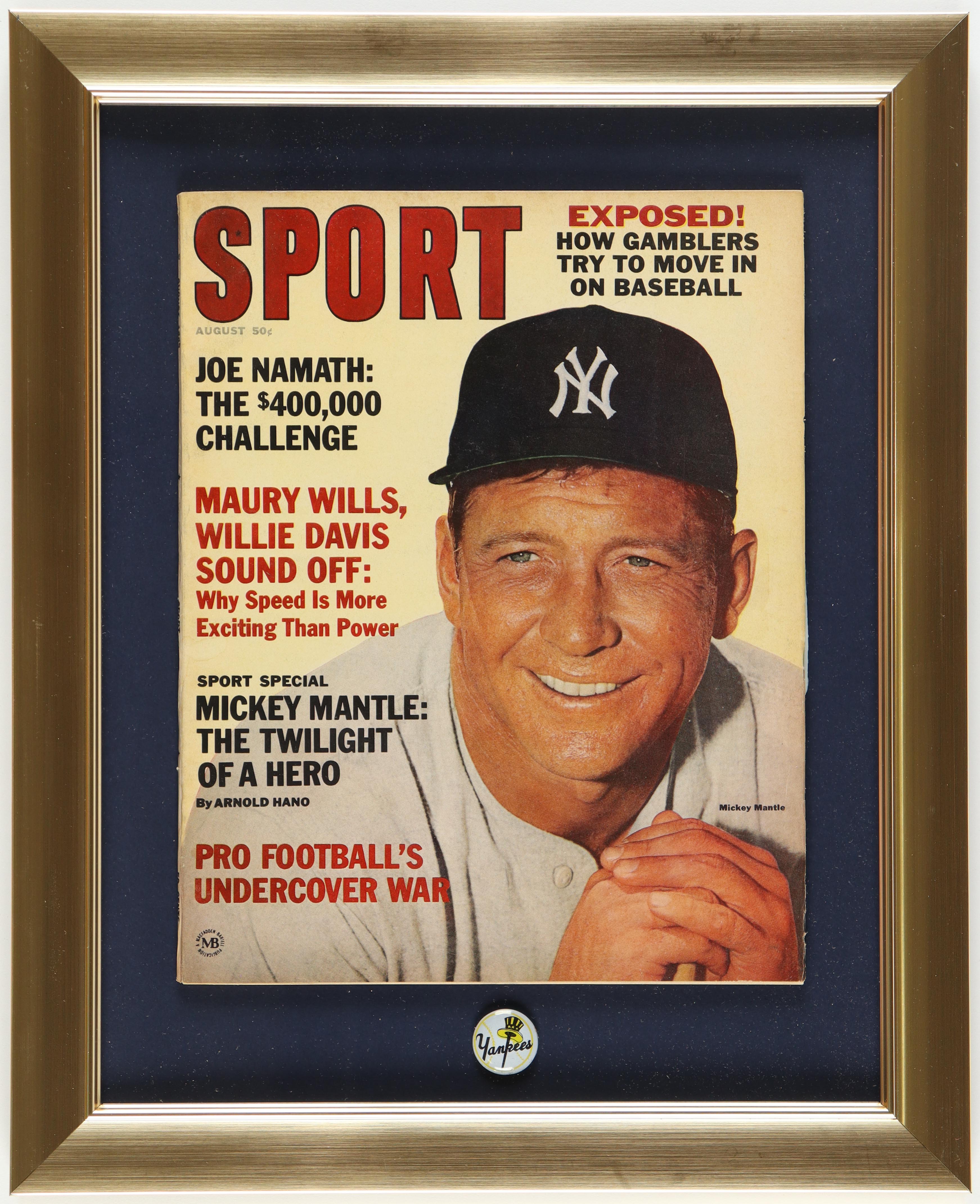 Mickey Mantle Custom Framed 1965 Sport Magazine Display With Vintage Yankees Lapel Pin