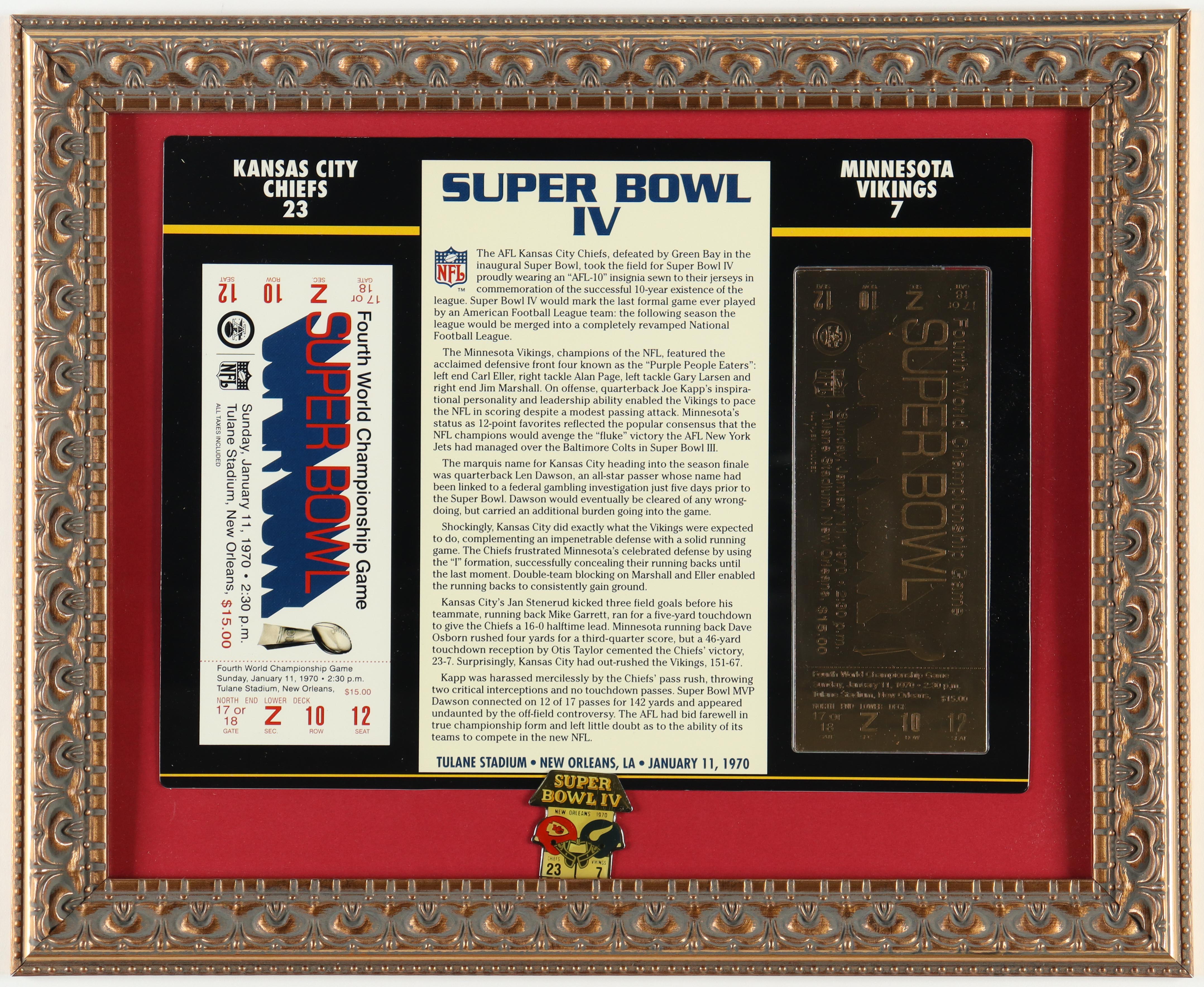 Custom framed display measures 13" x 16" in size and features a Super Bowl IV 23kt gold ticket and official Super Bowl IV Pin.