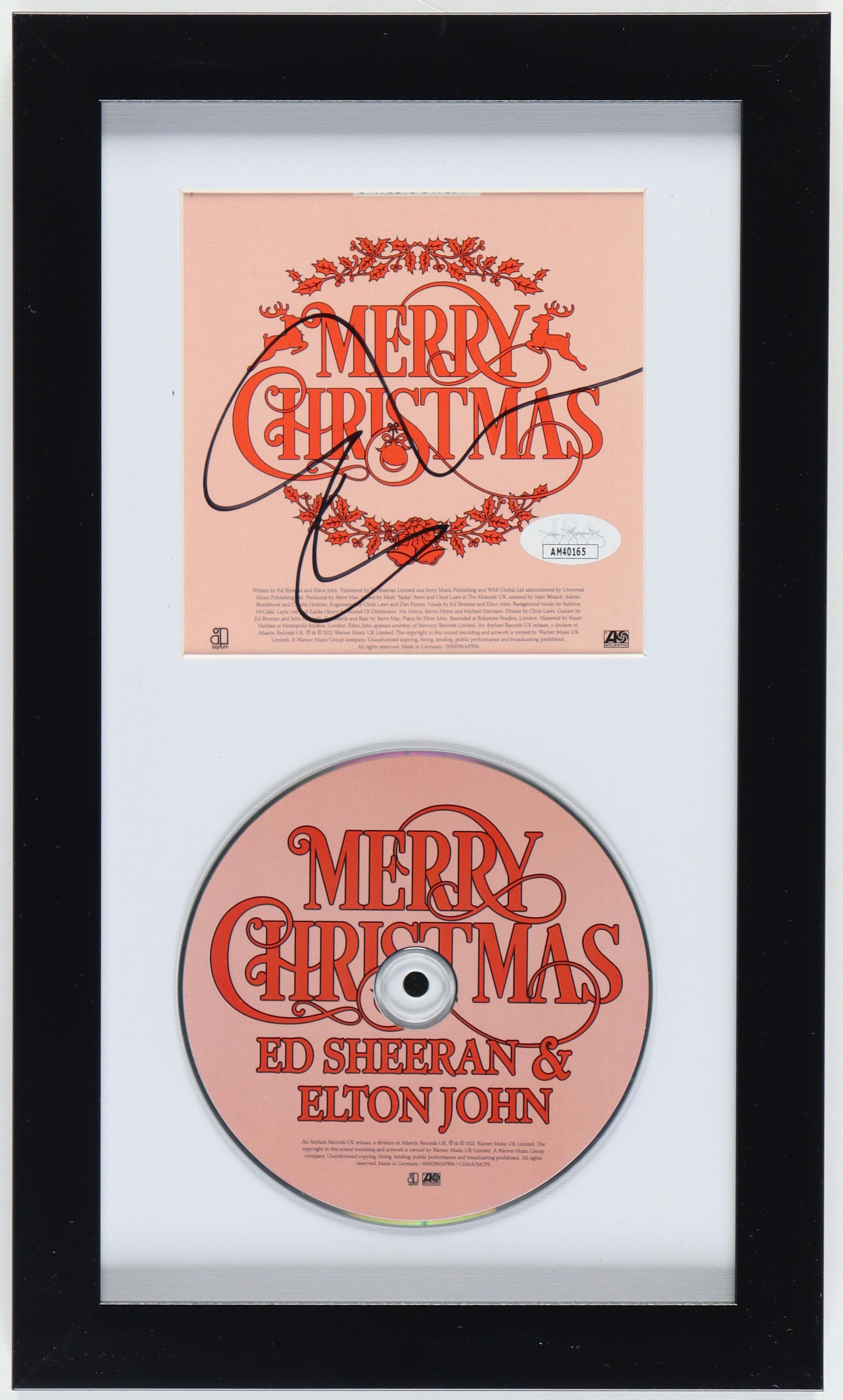 Custom frame measures approximately 8" x 13.5" in size. Features a "Merry Christmas: Ed Sheeran & Elton John" CD insert that has been hand-signed by Ed Sheeran. The display also includes compact disc as shown. Please note, there is scuffing on the frame borders.