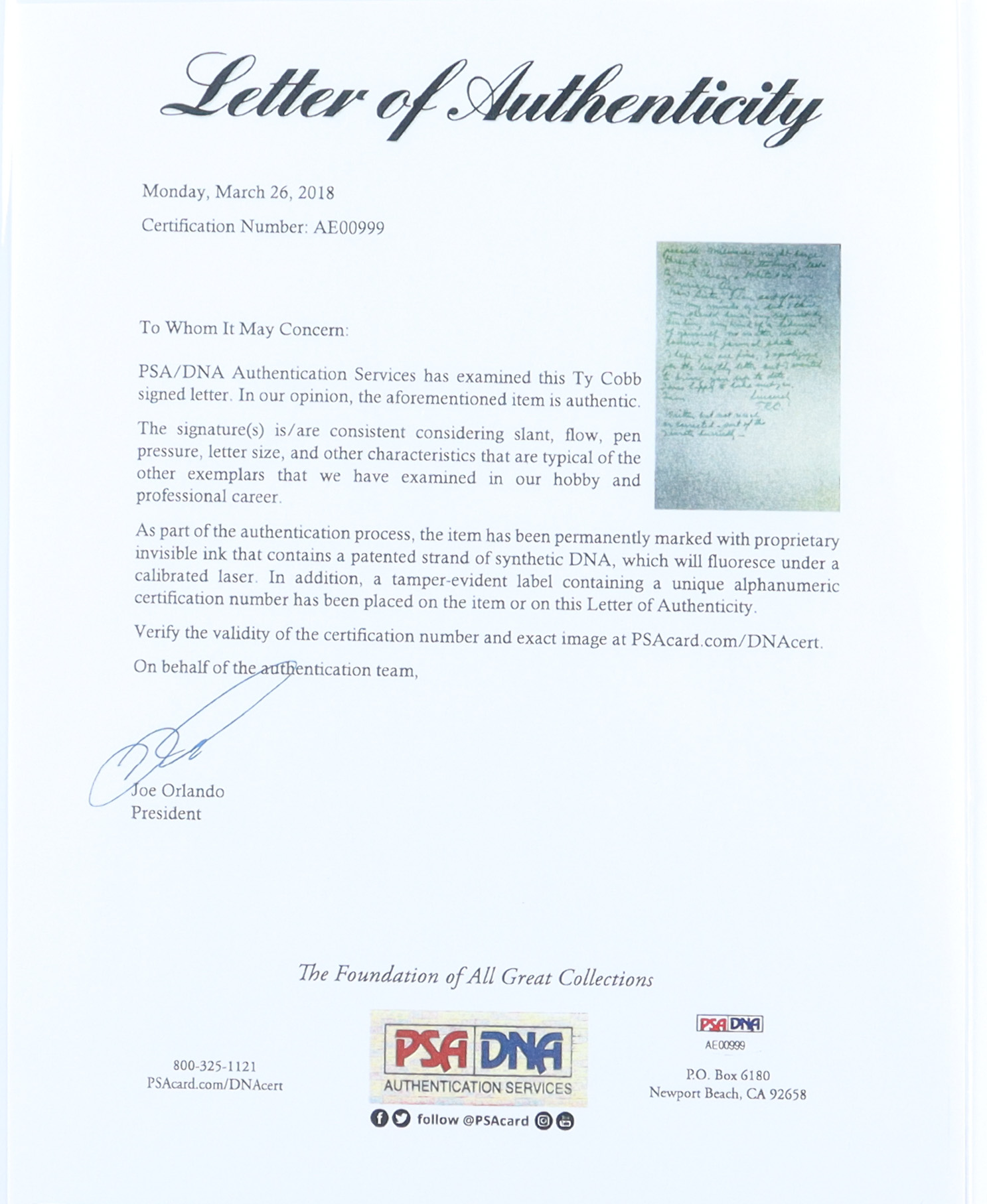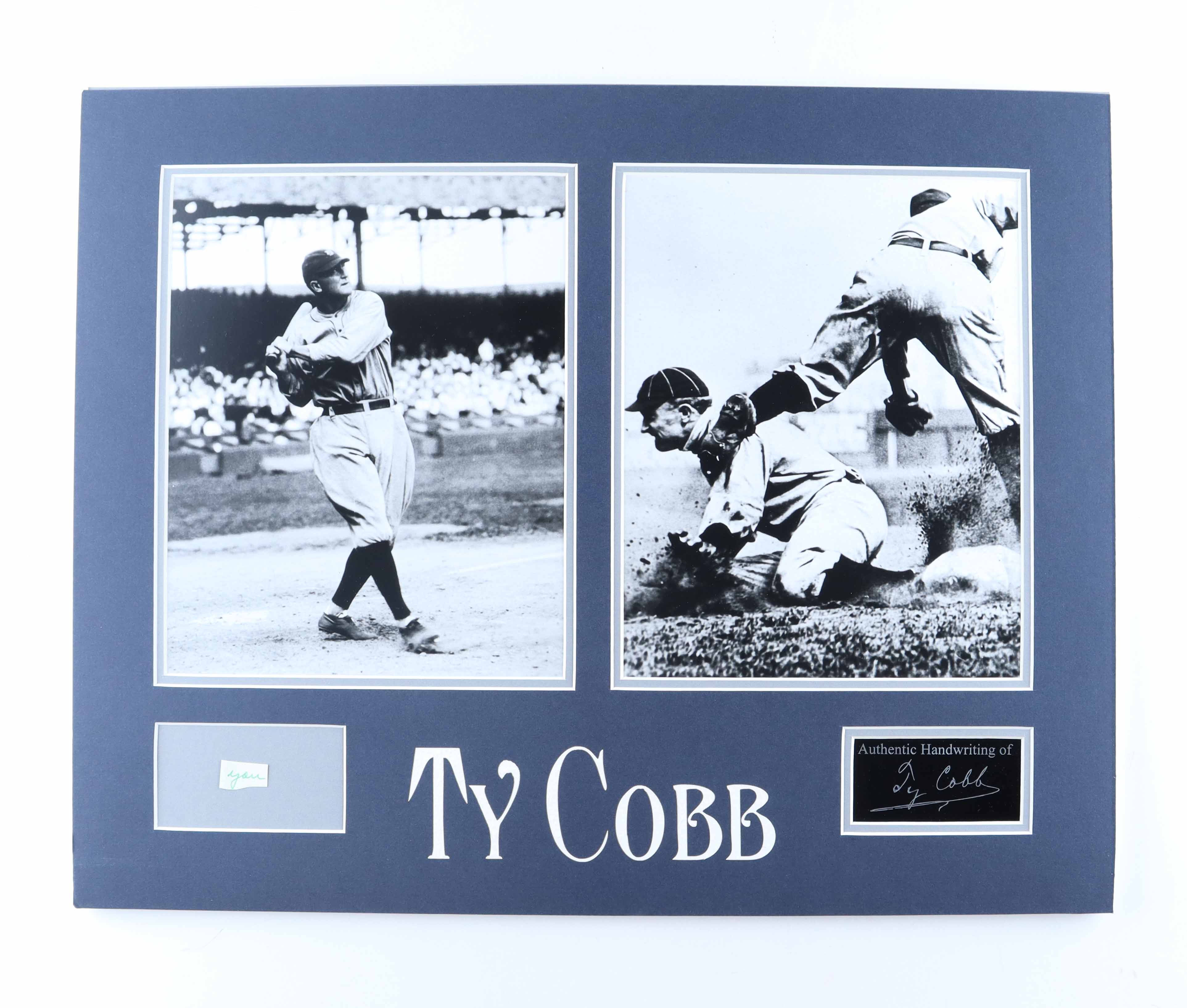 Custom matted display measures 16" x 20" in size and features a cut from a letter that had been hand-written by Ty Cobb (D. 1961, Detroit Tigers, HOF). Please note, Cobb did not sign the cut but he did write the word(s) that are featured on the cut.