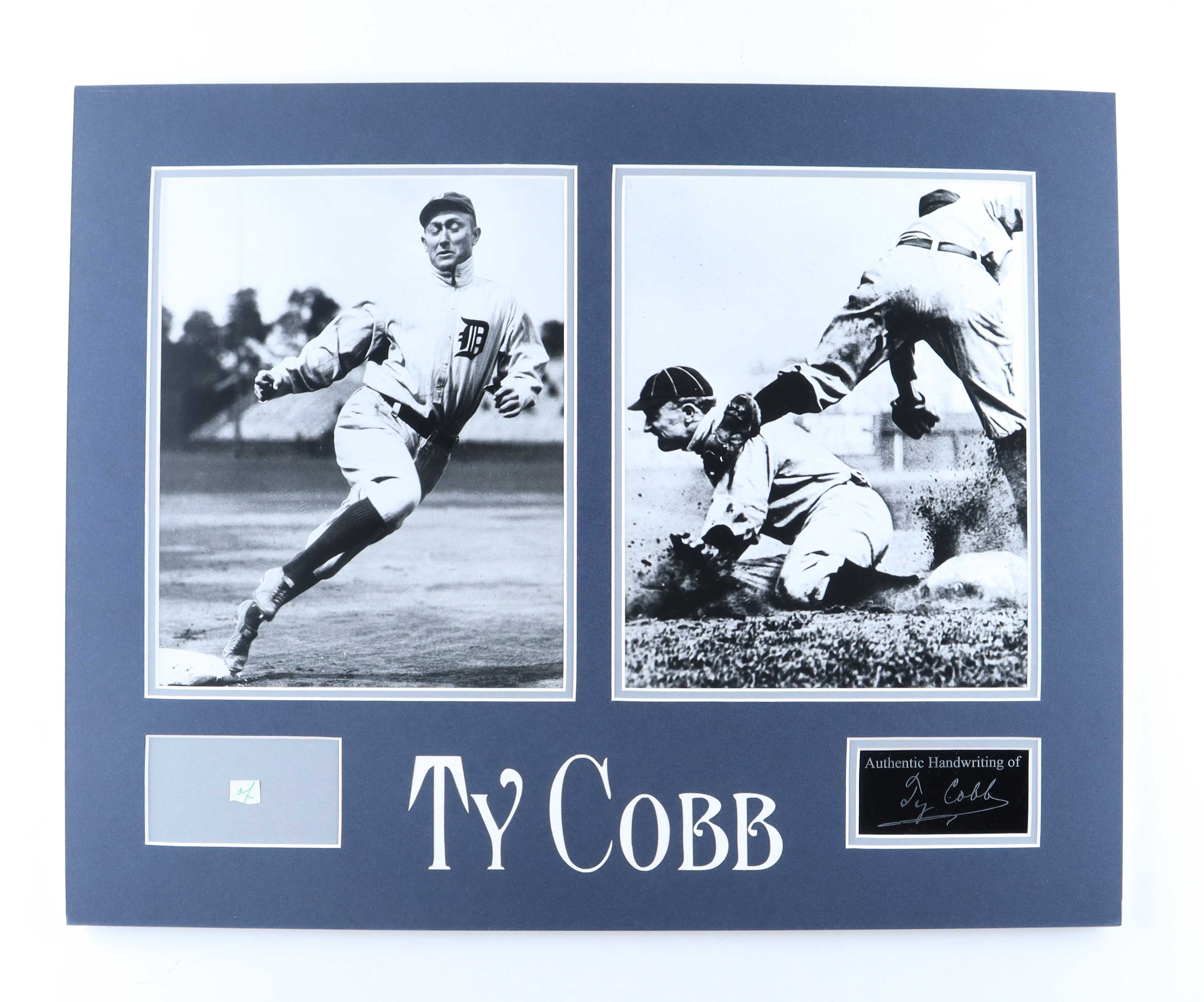 Custom matted display measures 16" x 20" in size and features a cut from a letter that had been hand-written by Ty Cobb (D. 1961, Detroit Tigers, HOF). Please note, Cobb did not sign the cut but he did write the word(s) that are featured on the cut.