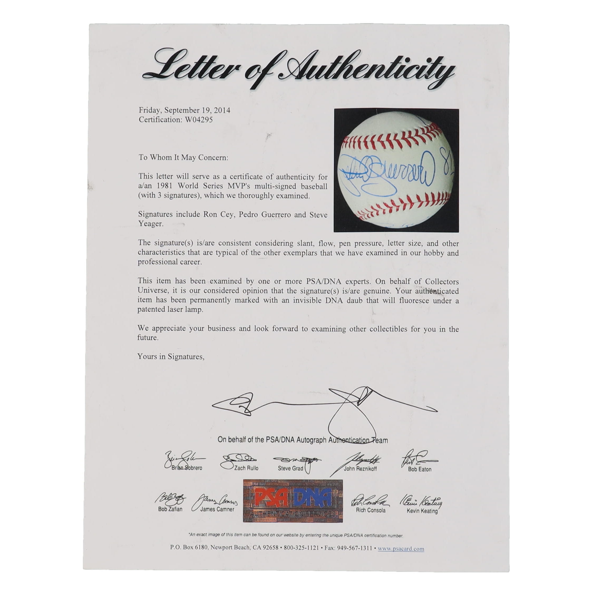 Rawlings Official League Baseball. Hand-signed and inscribed by Ron Cey (Los Angeles Dodgers), Pedro Guerrero (Los Angeles Dodgers) & Steve Yeager (Los Angeles Dodgers). Please note, signatures have bled. Refer to photos for condition of the baseball.