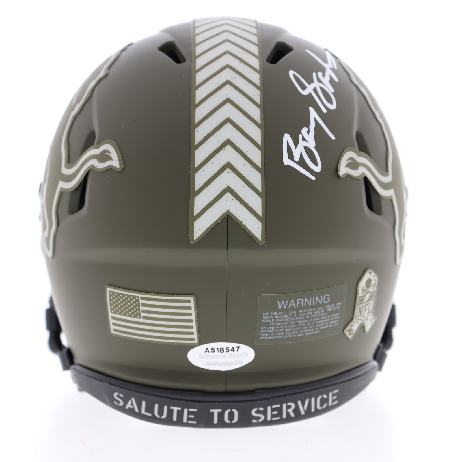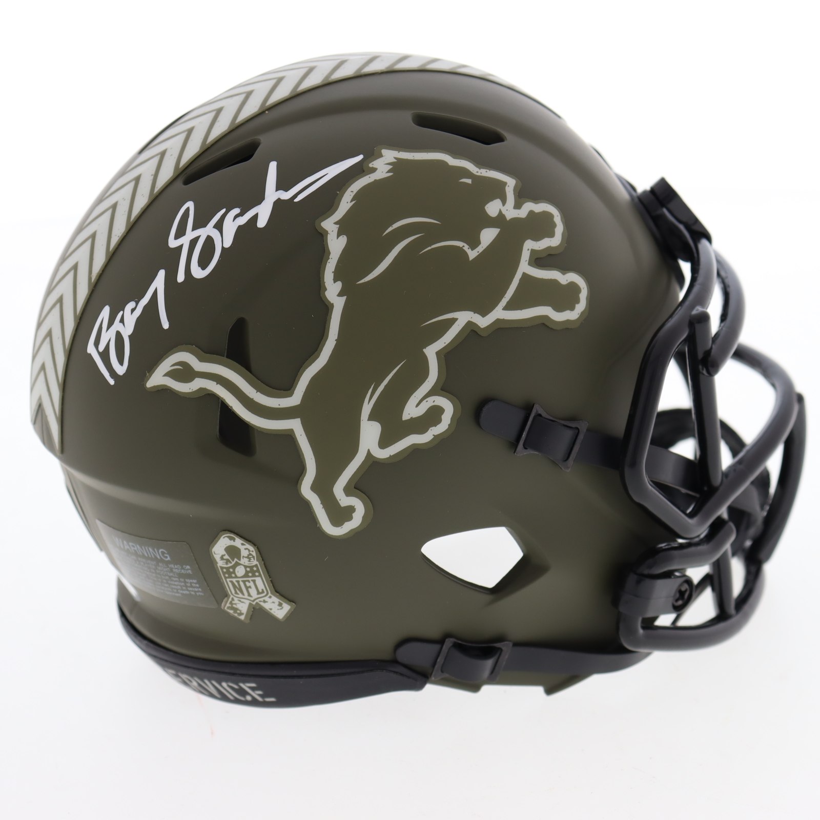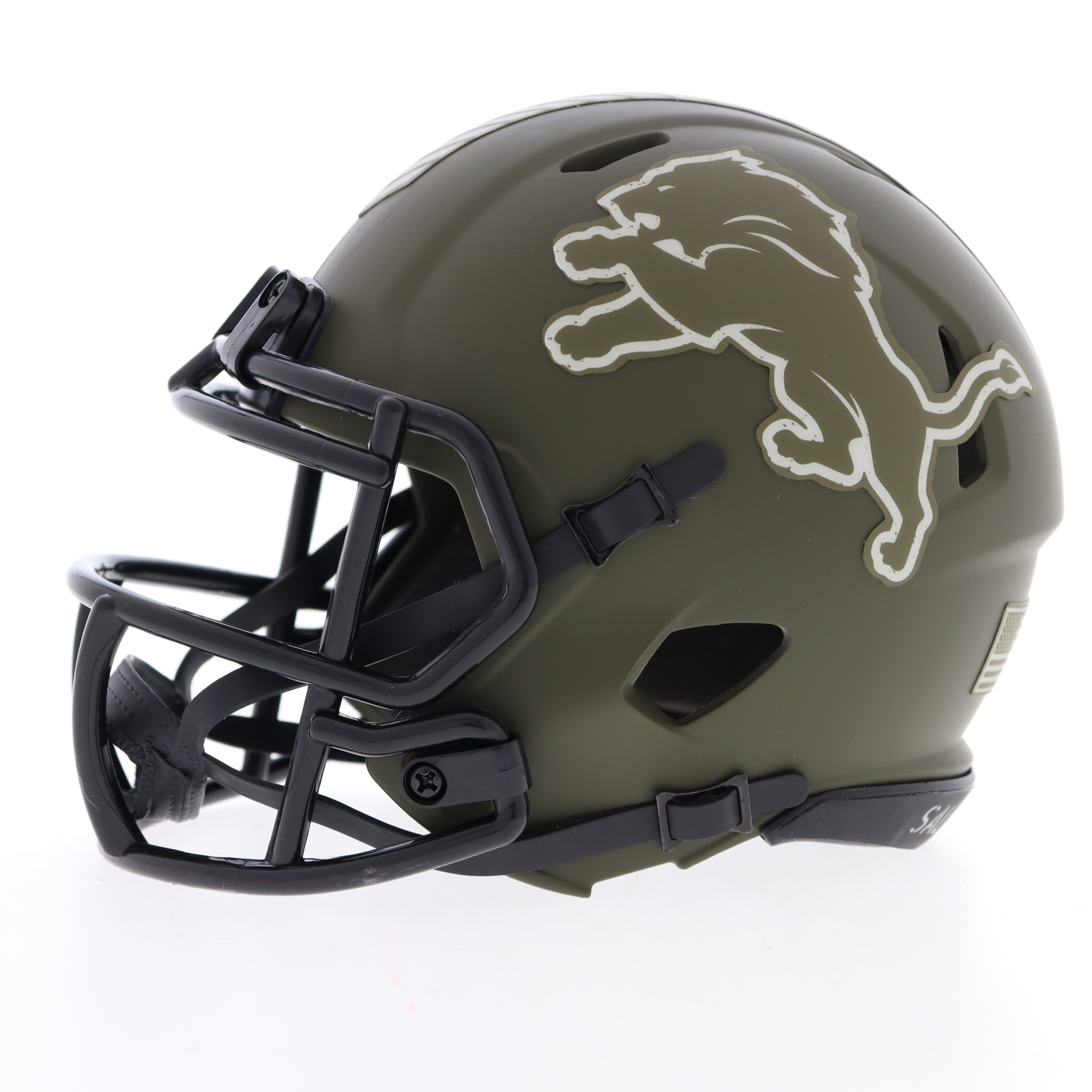 Riddell Detroit Lions Salute to Service Alternate Speed mini helmet. Hand-signed by Barry Sanders (HOF).