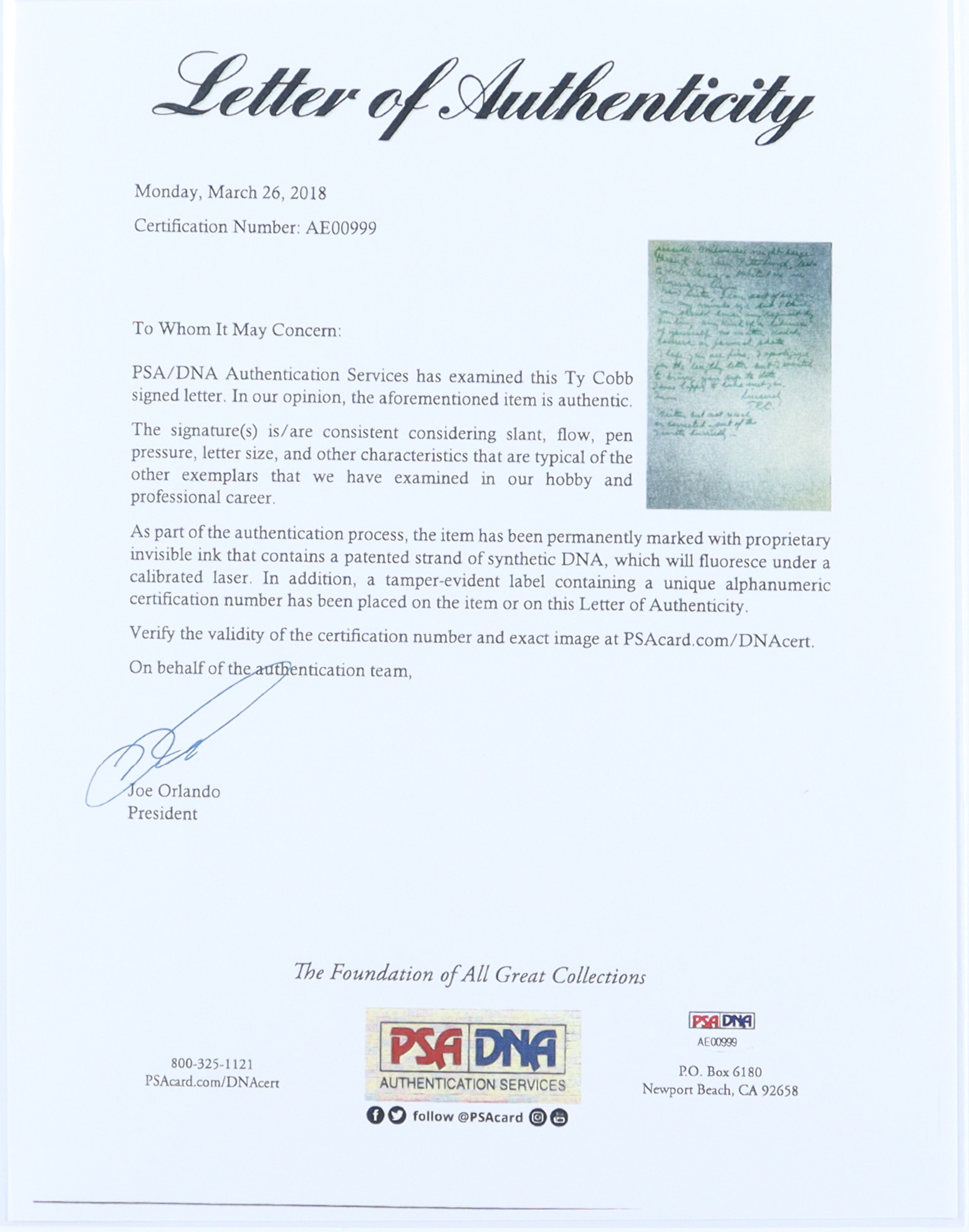 Ty Cobb Hand-Written Tigers Custom Matted Cut Display (PSA)