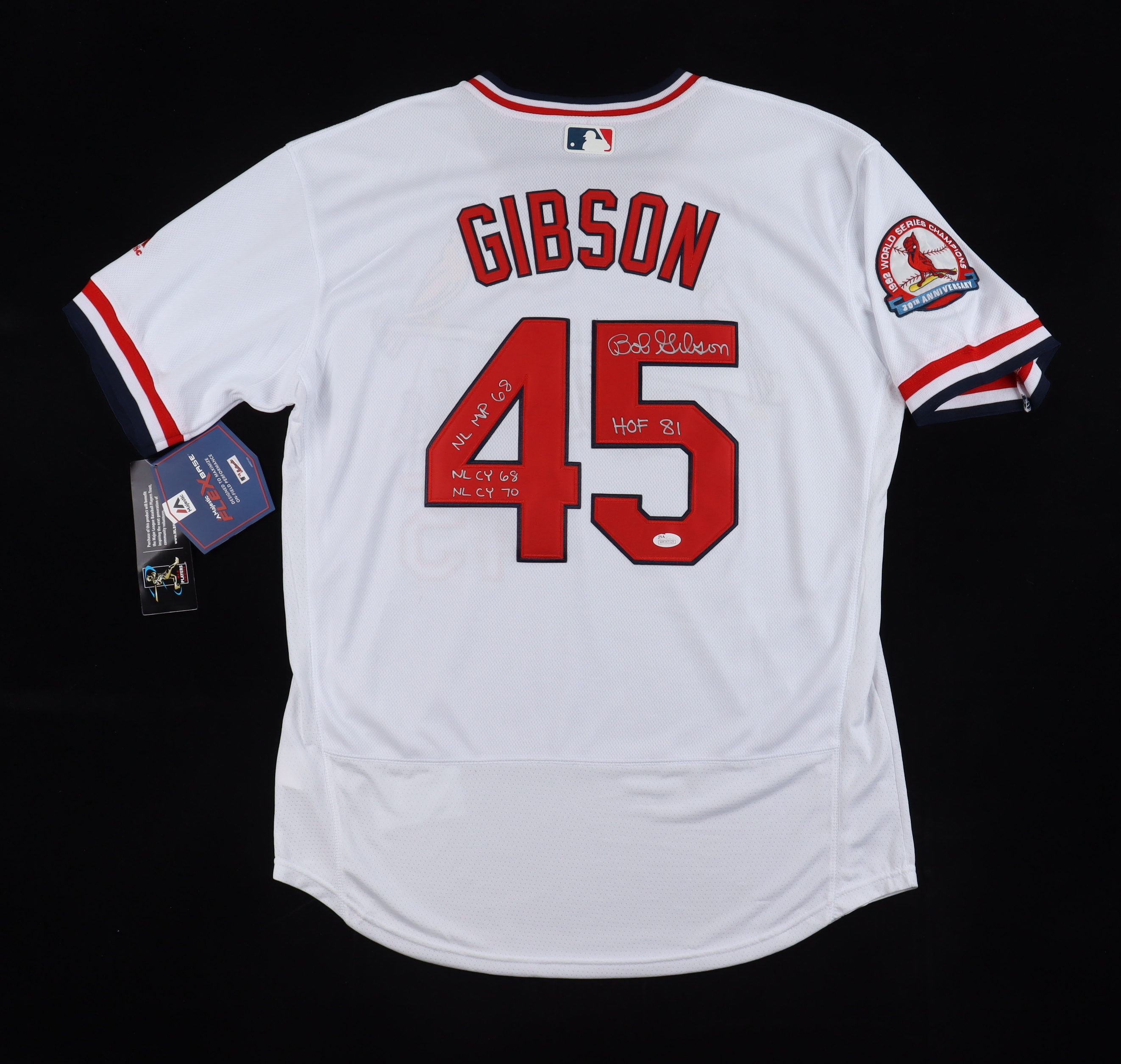 Majestic jersey. Everything is sewn on, size 44. Hand-signed and inscribed by Bob Gibson (D. 2020, St. Louis Cardinals, HOF).