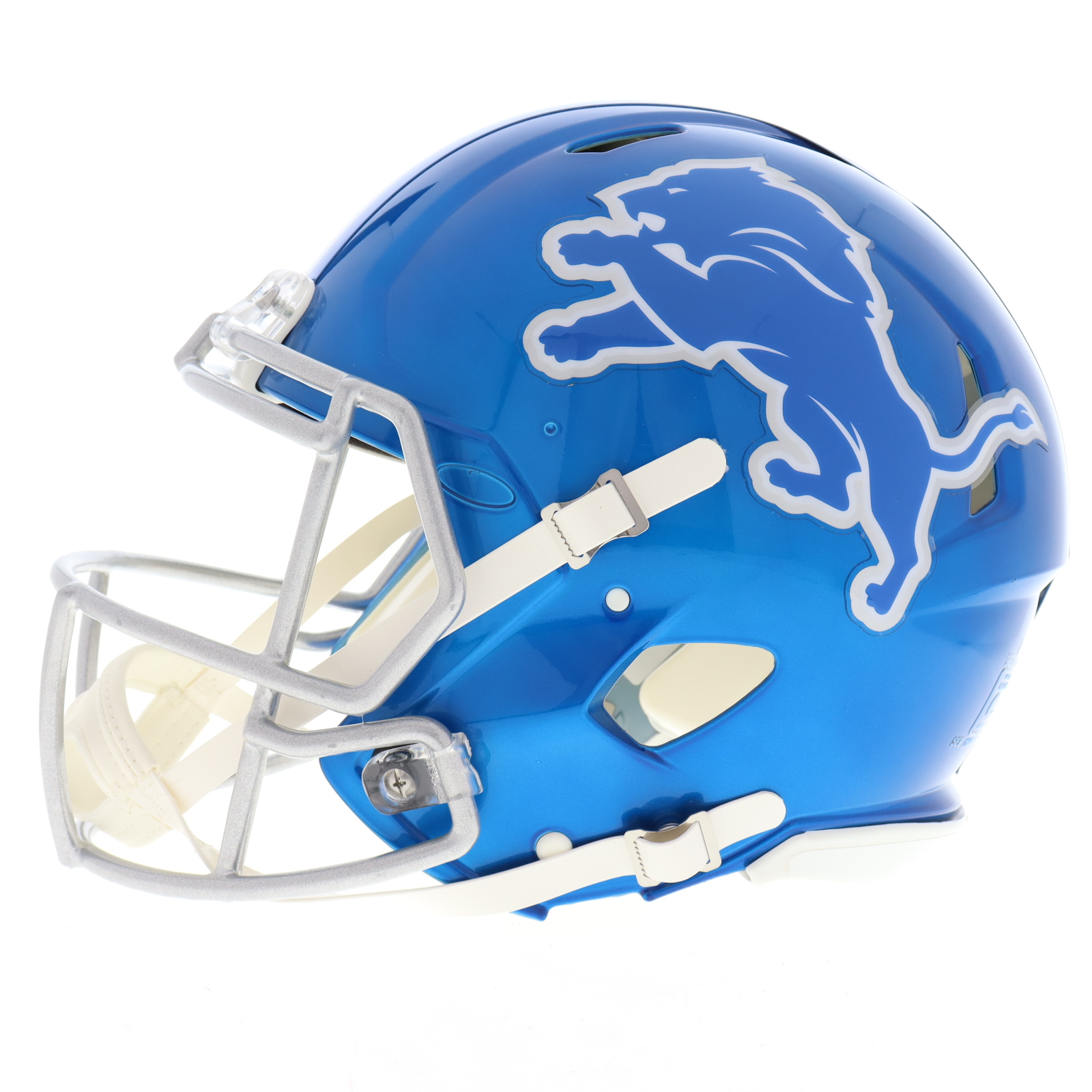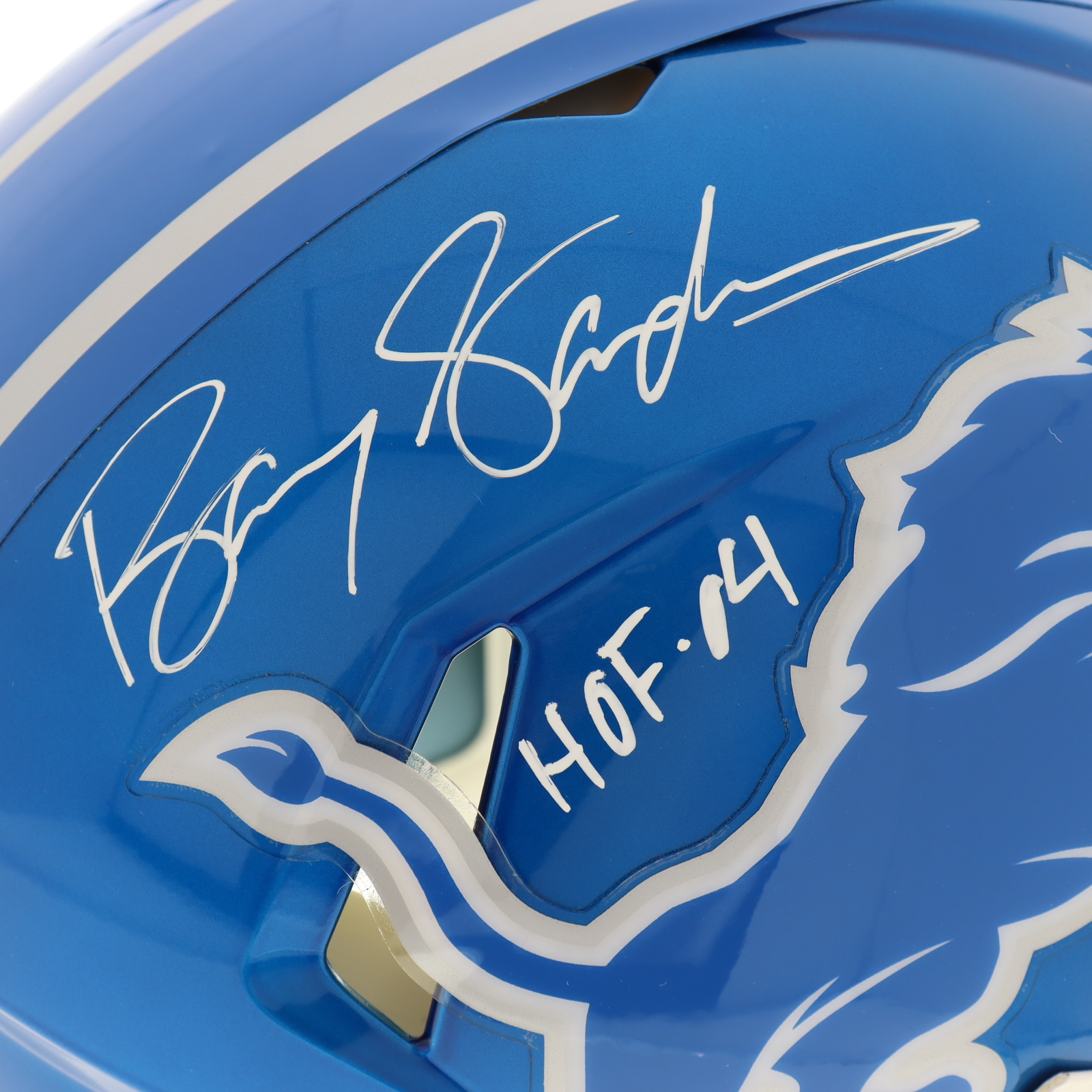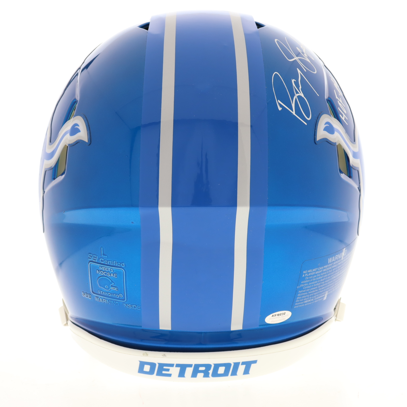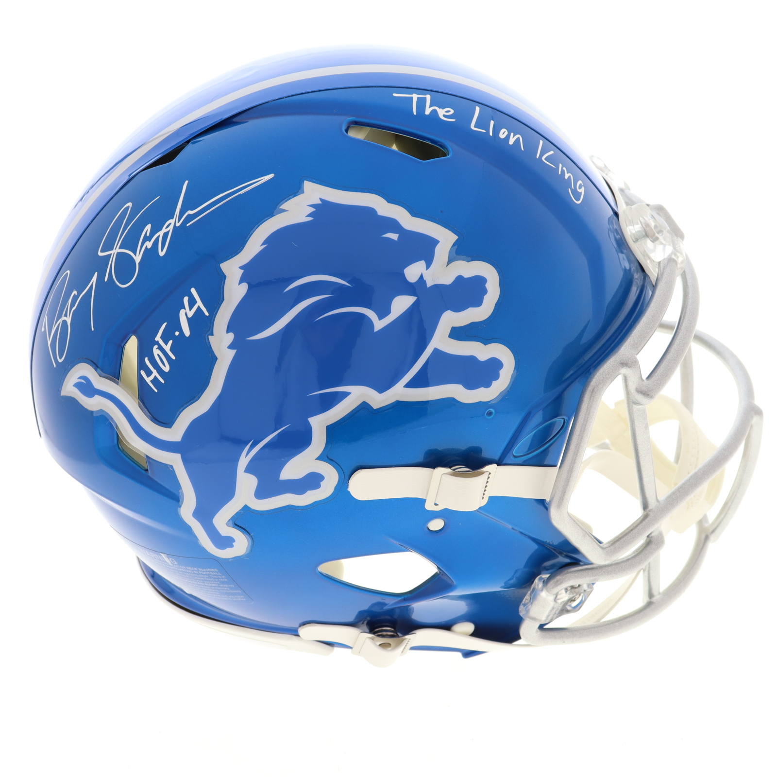 Riddell Detroit Lions Full-Size Authentic On-Field Flash Alternate Speed Helmet. Hand-signed and inscribed by Barry Sanders (HOF).