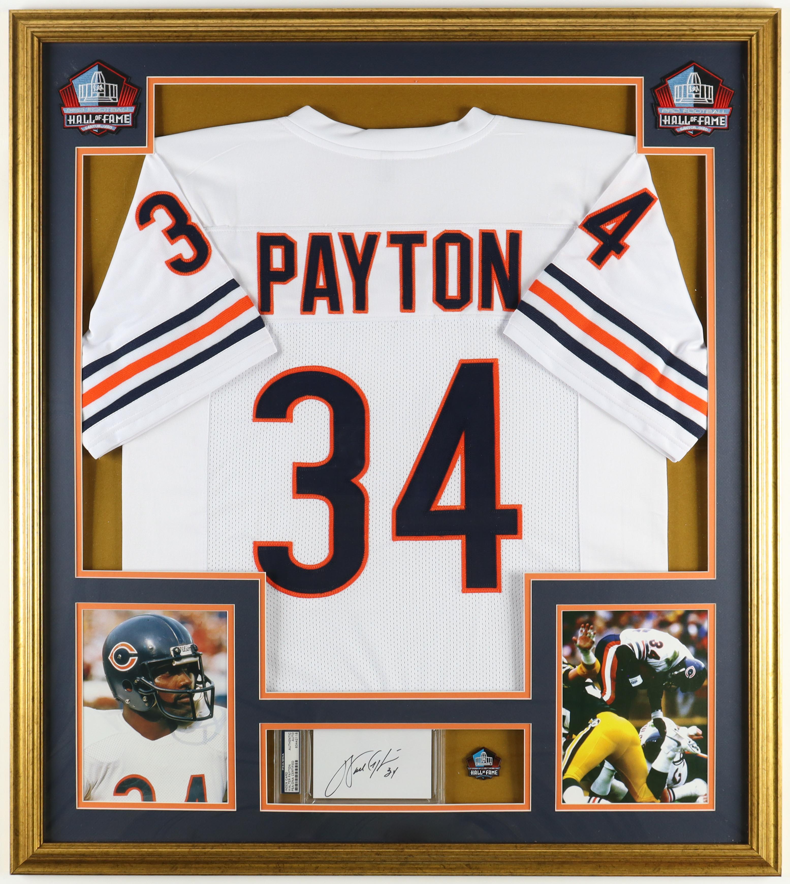 Walter Payton Signed Bears Custom Framed Cut Display with Jersey, Official Hall Of Fame Pin & (2) Hall Of Fame Patches (PSA)