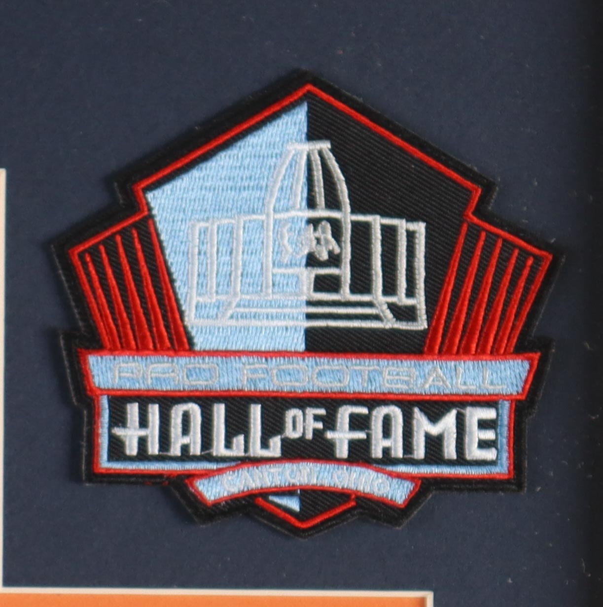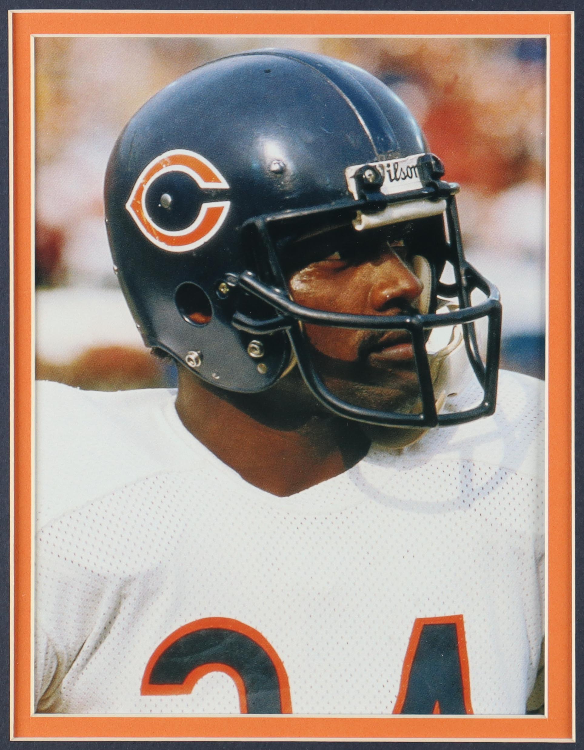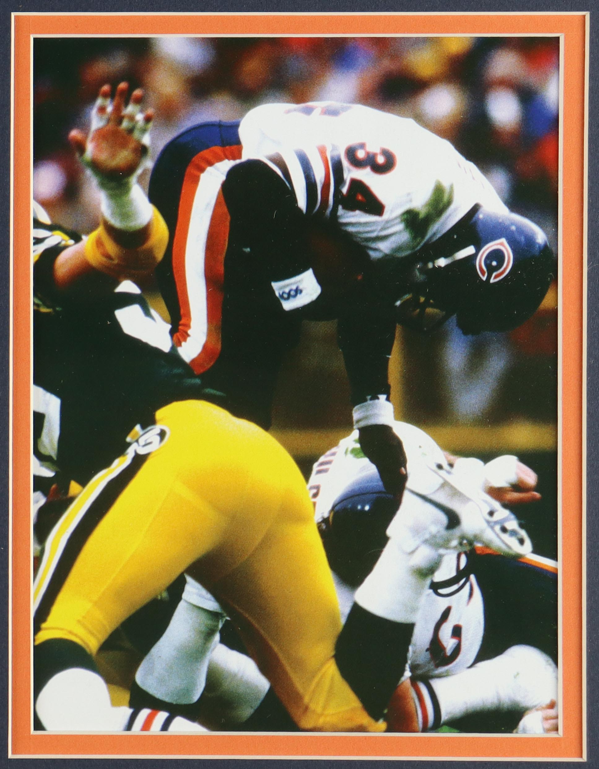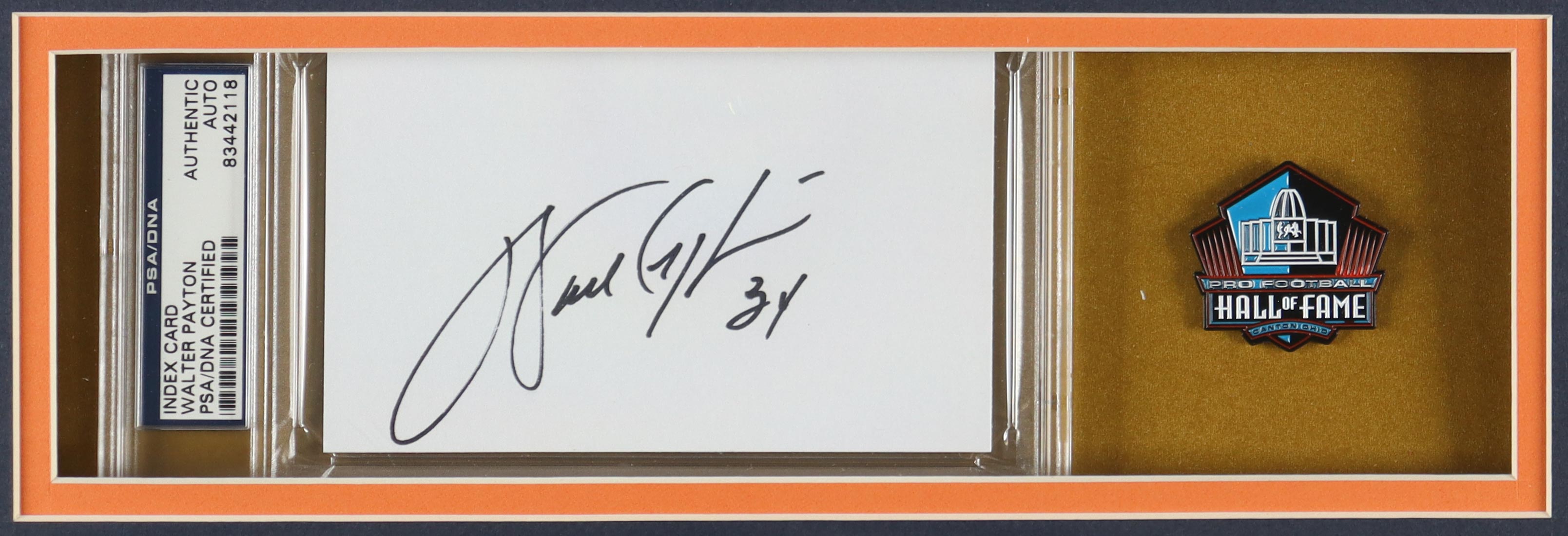 Custom frame measures approximately 33" x 37" in size and and features a cut that has been hand-signed by Walter Payton (D. 1999, Chicago Bears, HOF). The display also includes an unsigned jersey as well as an Official Hall Of Fame Pin and (2) Hall Of Fame Patches.