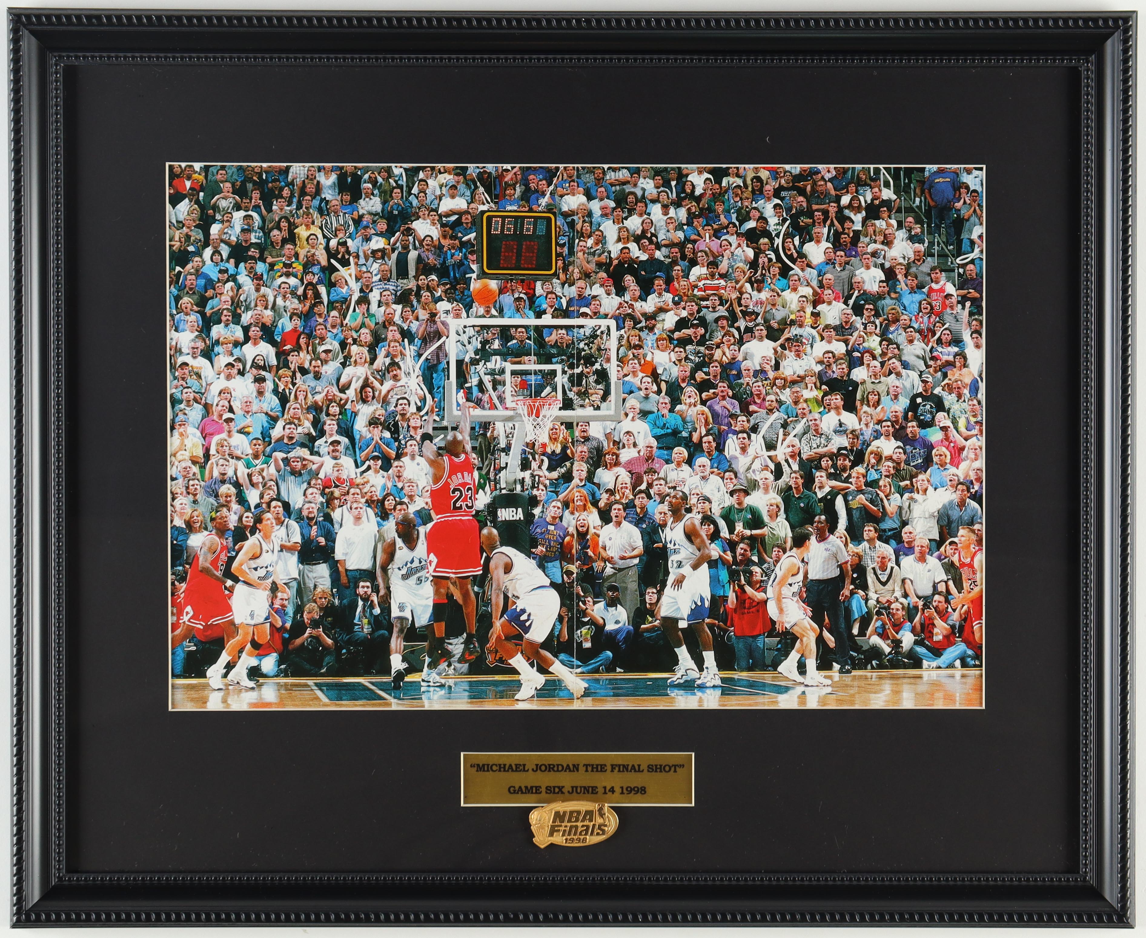 Custom frame measures approximately 18" x 22" in size. Features an unsigned photo of Michael Jordan (Chicago Bulls, HOF) "The Last Shot". Display also features a 1998 NBA Finals gold pin.