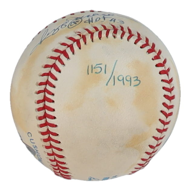 Rawlings Official American League baseball. Hand-signed and inscribed by Reggie Jackson (New York Yankees, HOF). Please note, the baseball is naturally toned. Item is hand-numbered limited edition #151/1993.