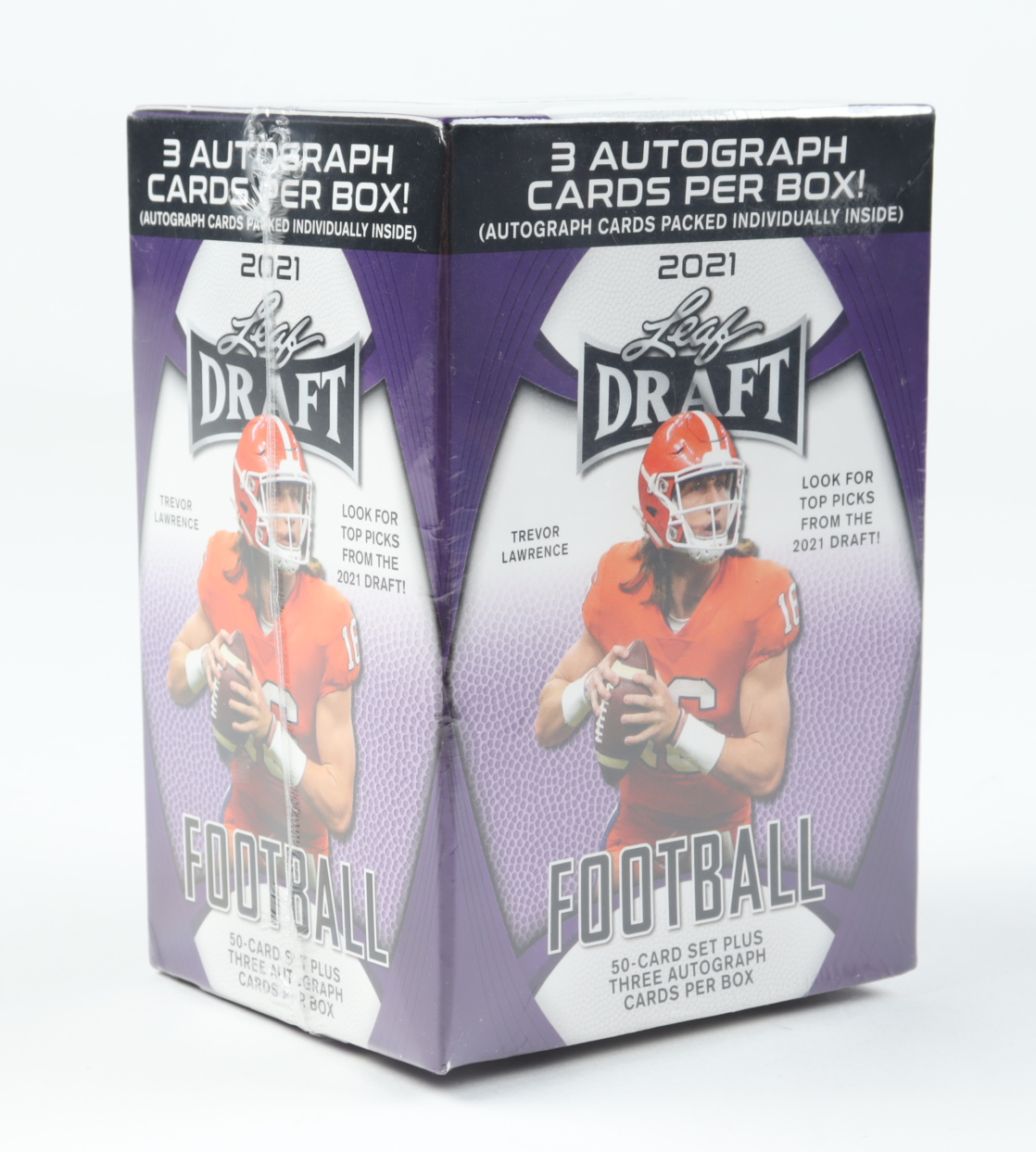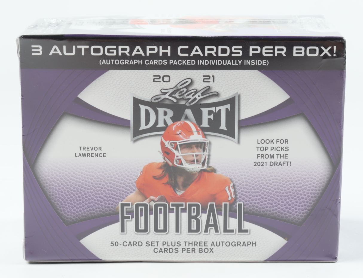50 card Rookie Draft set + 3 autographed cards per box (including 1 subject from Leaf's hobby football sets).