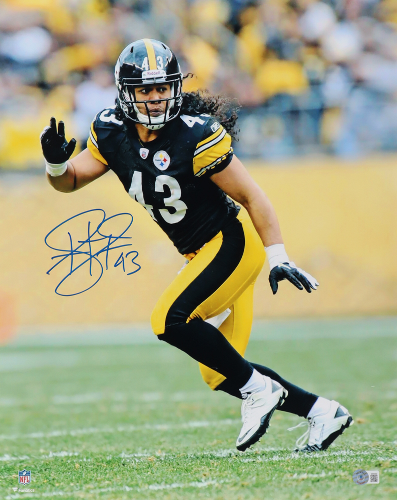Photo measures 16" x 20" in size and has been hand-signed by Troy Polamalu (Pittsburgh Steelers, HOF).