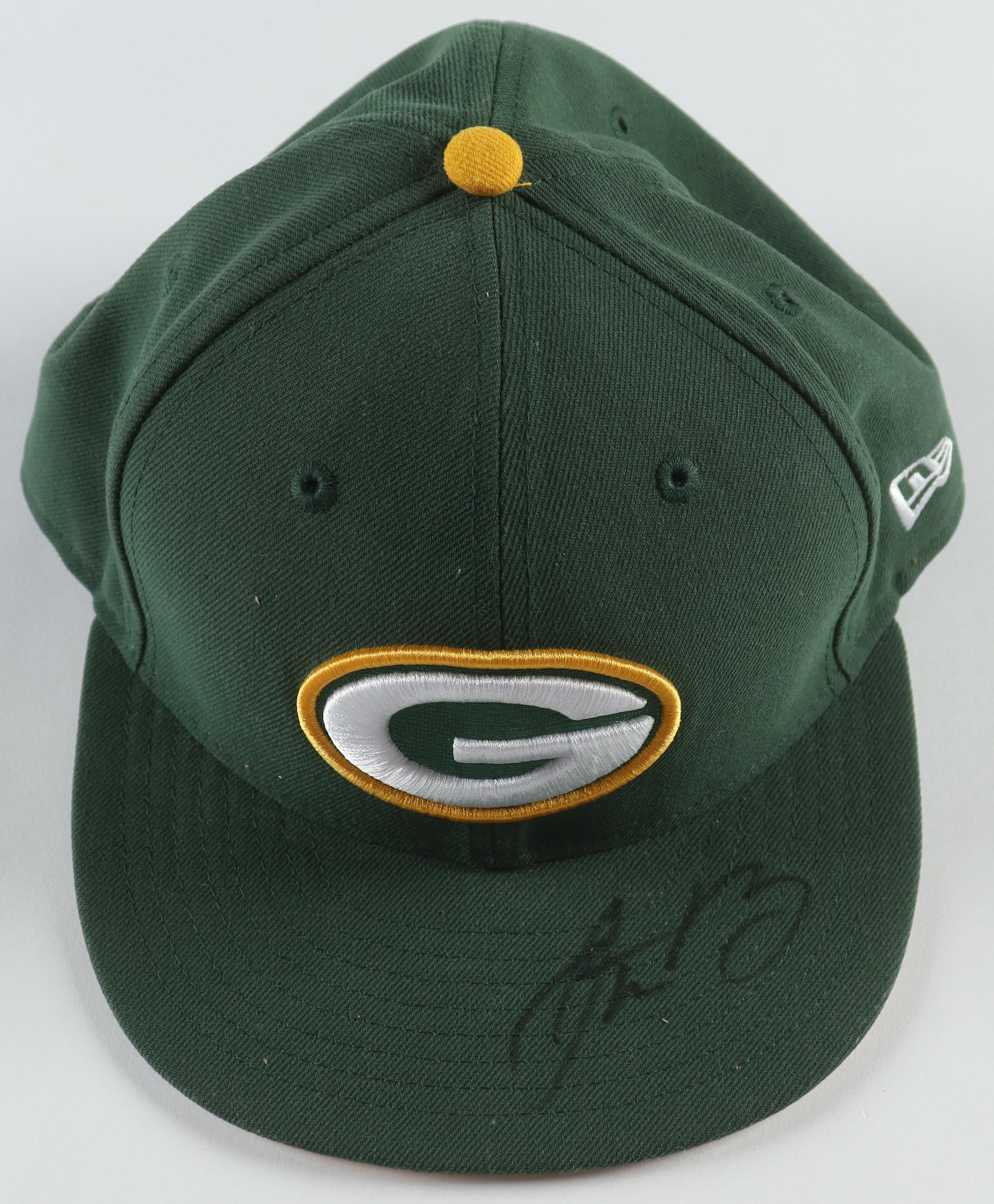 Green Bay Packers logo New Era fitted hat, size 7 3/8. Hand-signed by Aaron Rodgers.