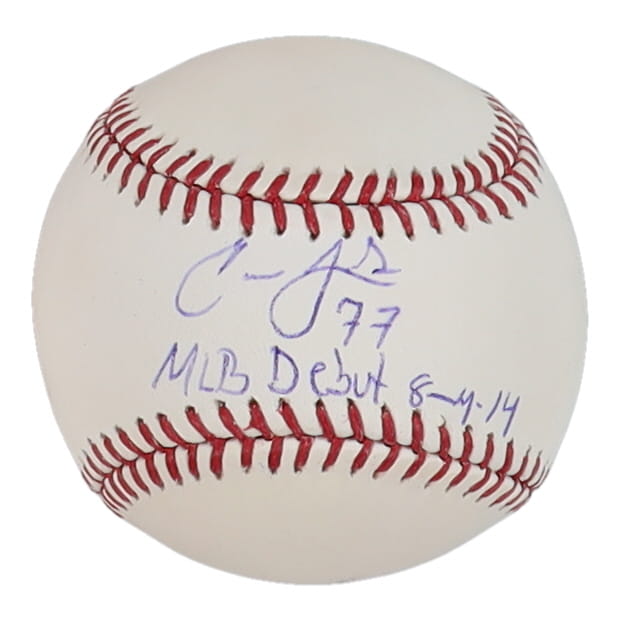 Carlos Frias Signed OML Baseball Inscribed "MLB Debut 8-4-14" (JSA)