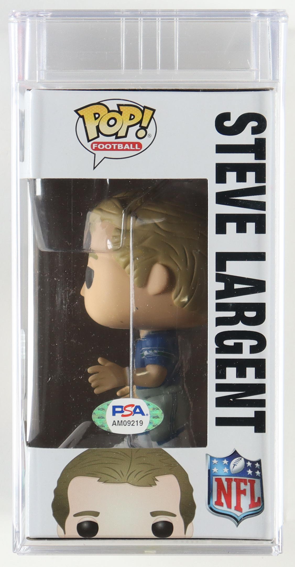 Cut measures approximately 2" x 2" in size and has been hand-signed by Steve Largent (Seattle Seahawks, HOF). Also features a Funko Pop! vinyl figure that measures approximately 4" tall.