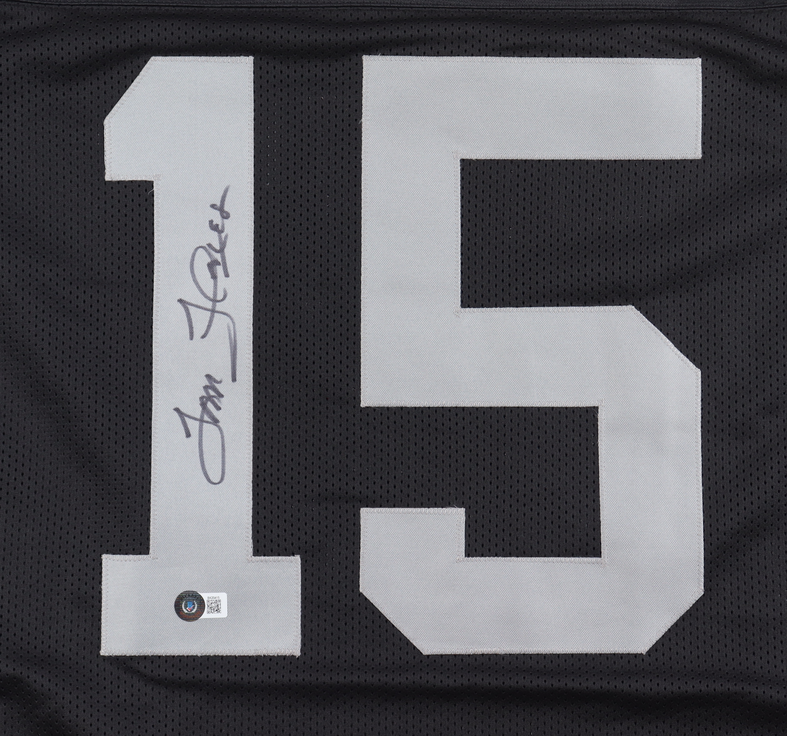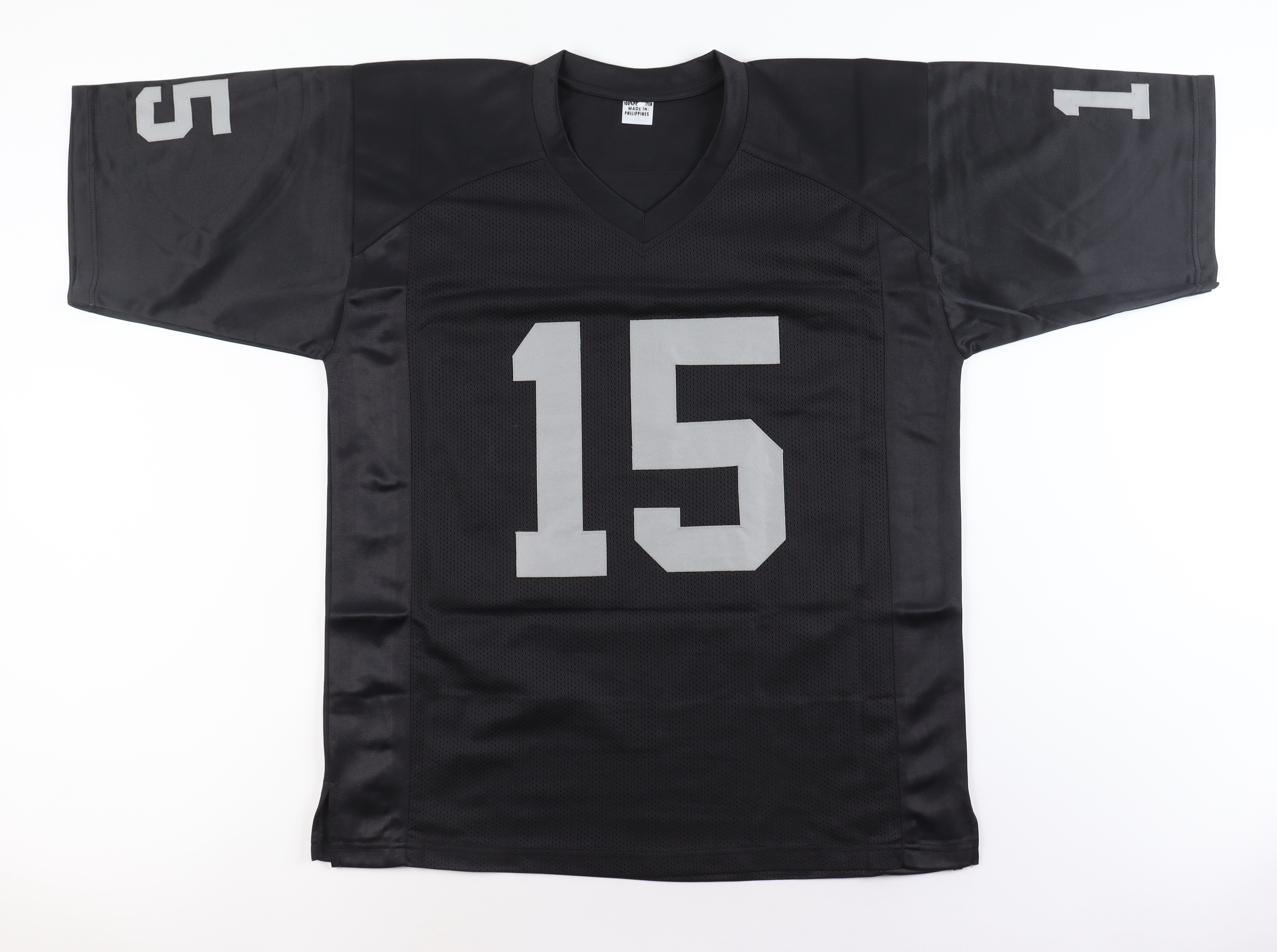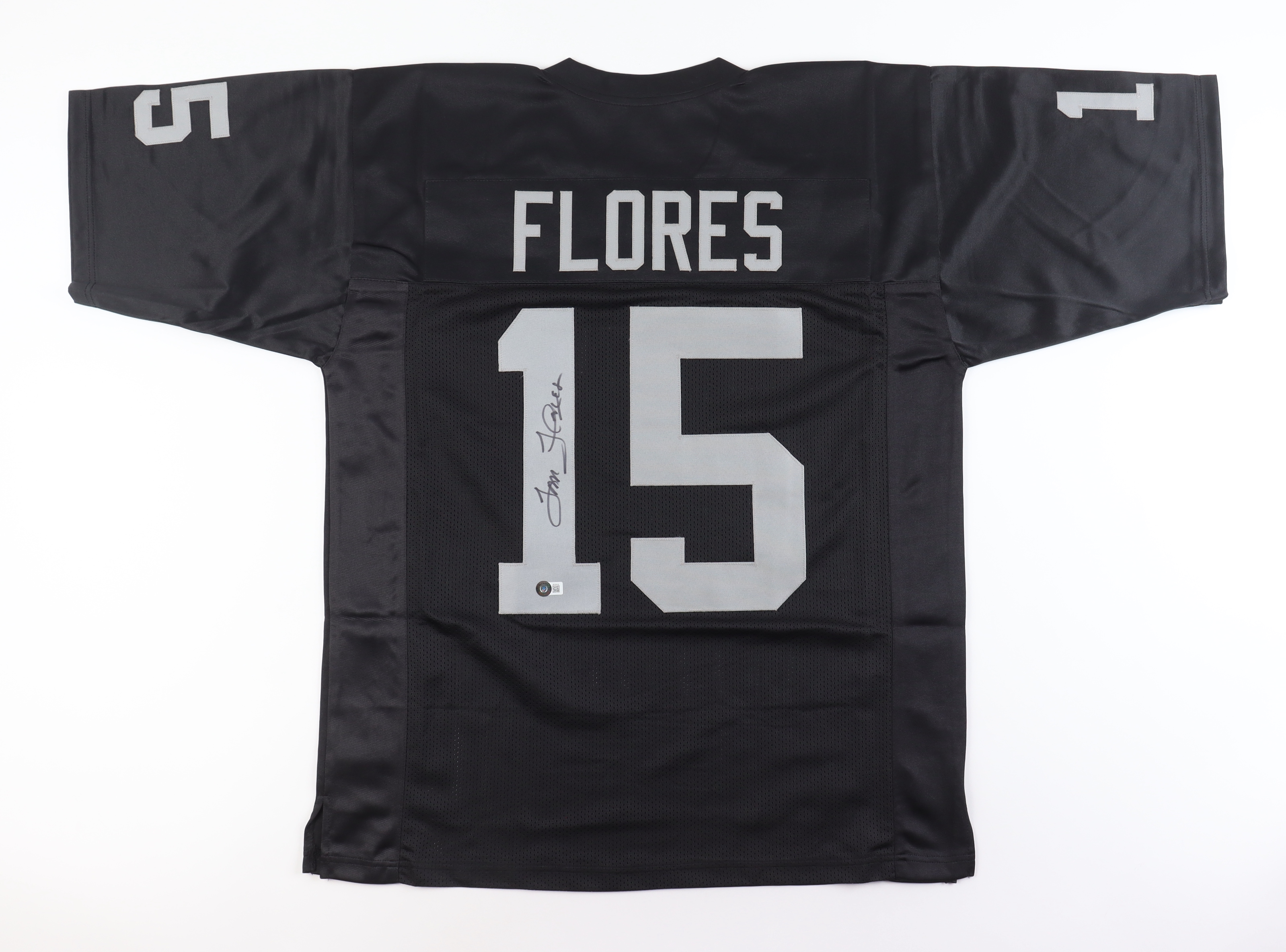 Custom jersey with everything sewn on, size XL. Hand-signed by Tom Flores (HOF).