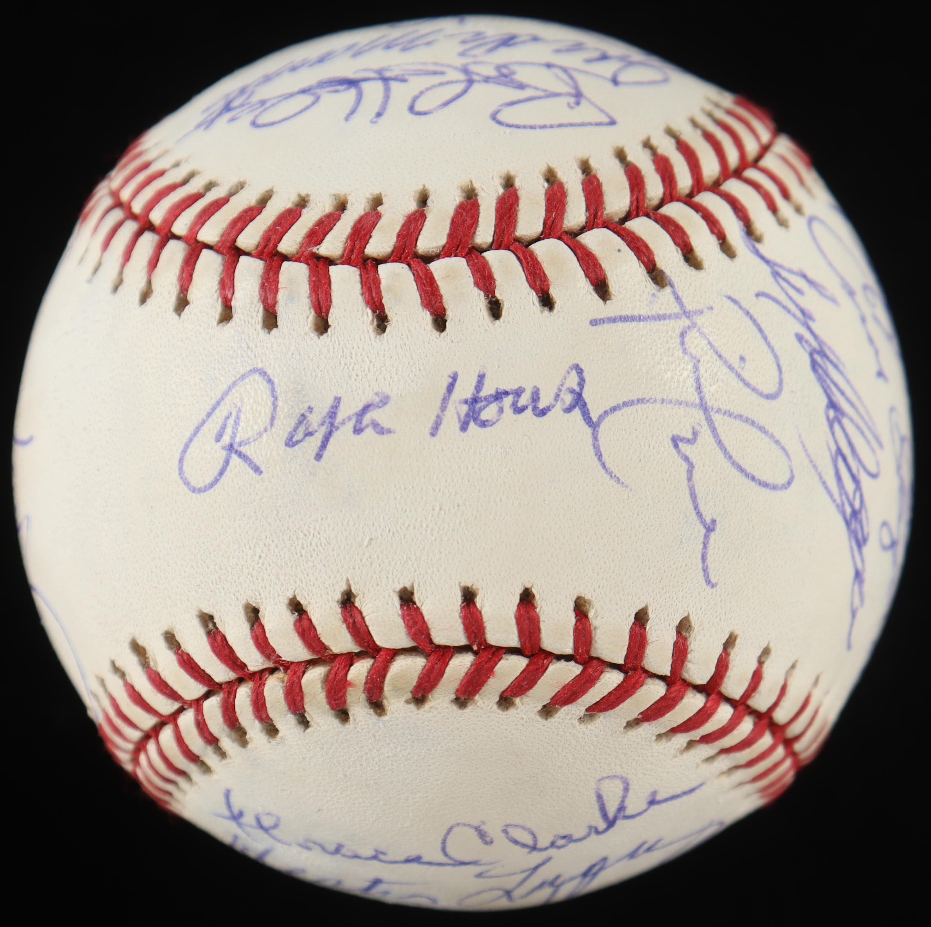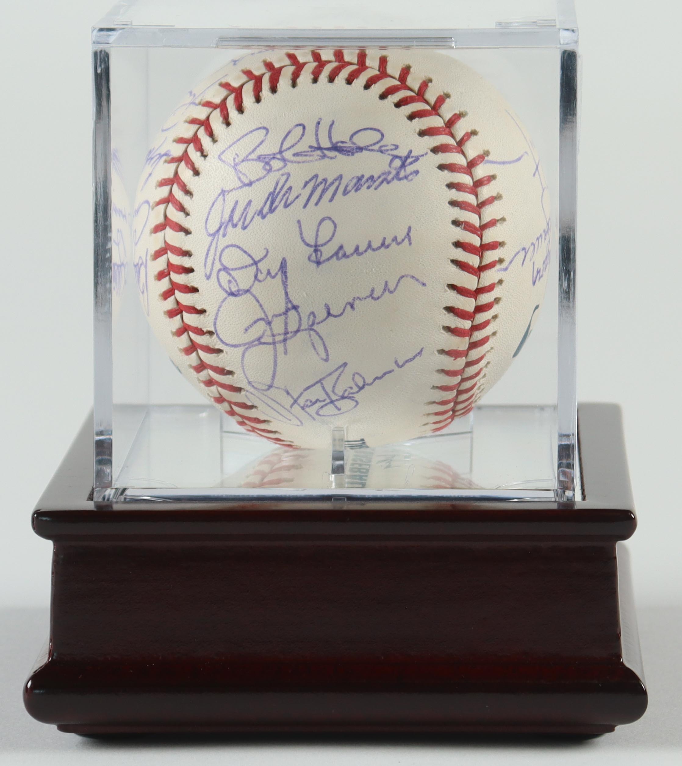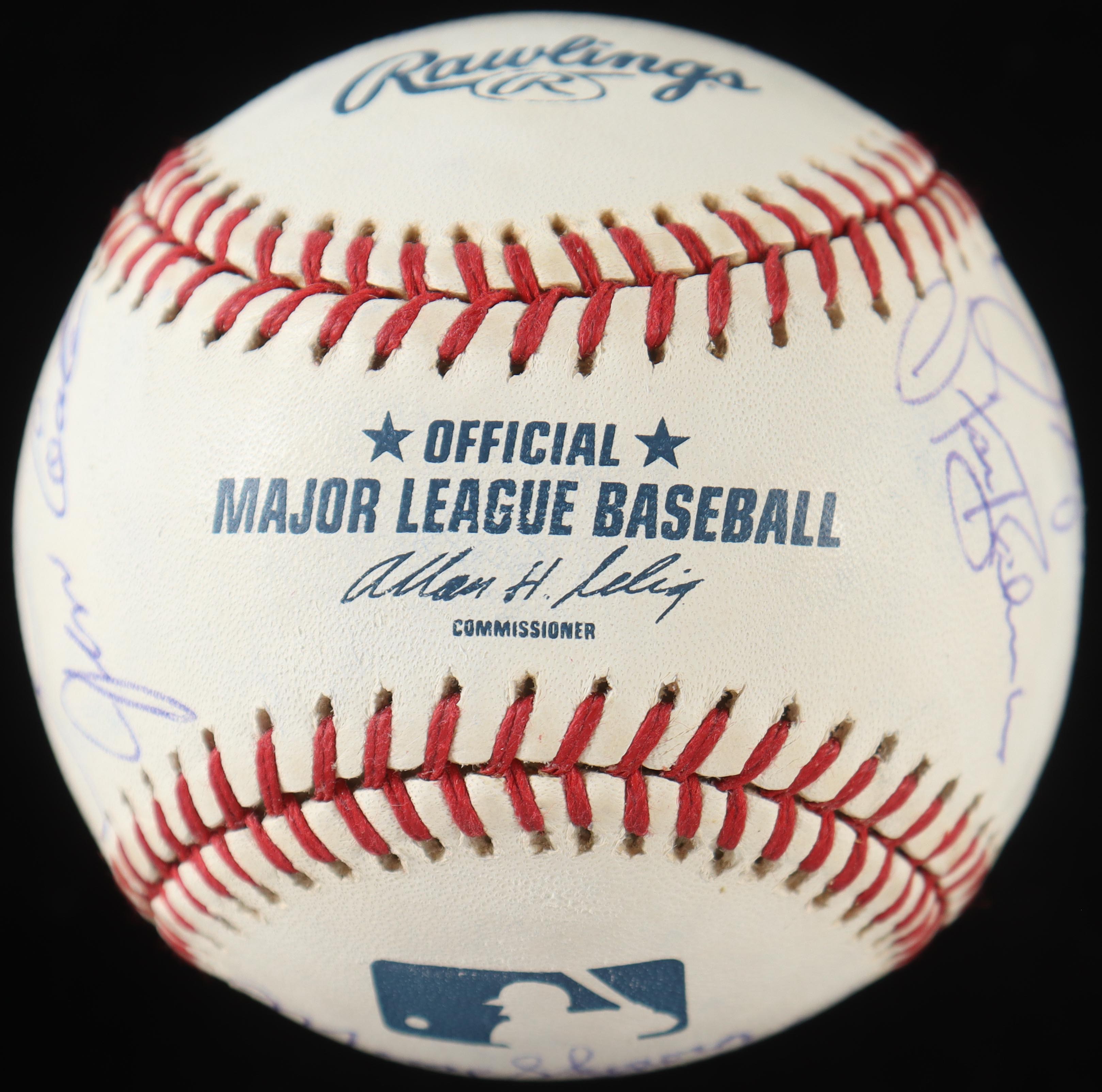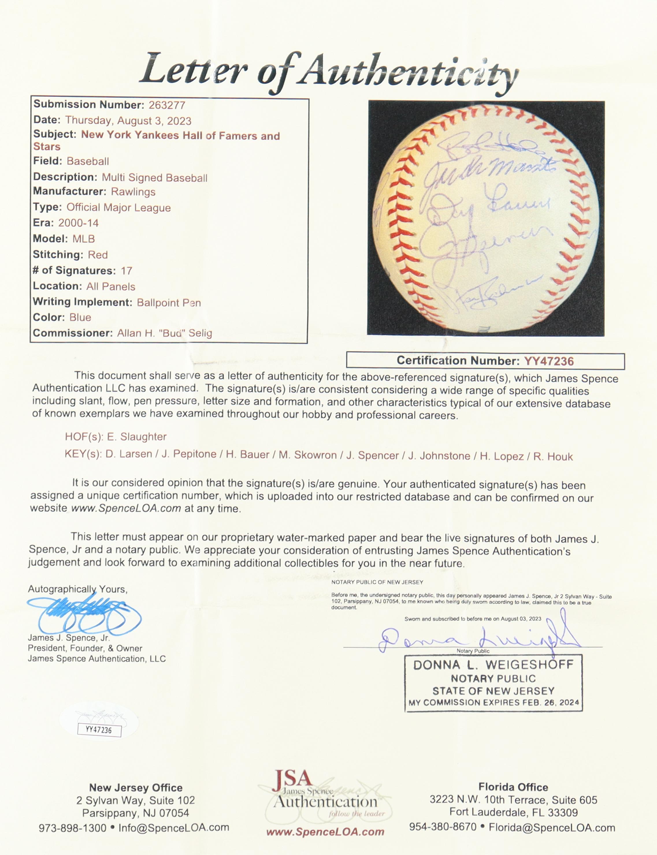 Rawlings Official Major League baseball has been hand-signed by (17) with Enos Slaughter, Don Larsen, Hank Bauer, Bill Skowron, Hector Lopez, Jim Spencer, Jay Johnstone, Joe Pepitone, Ralph Houk and (8) others. Display case is included as shown. Please note, the baseball is naturally toned.