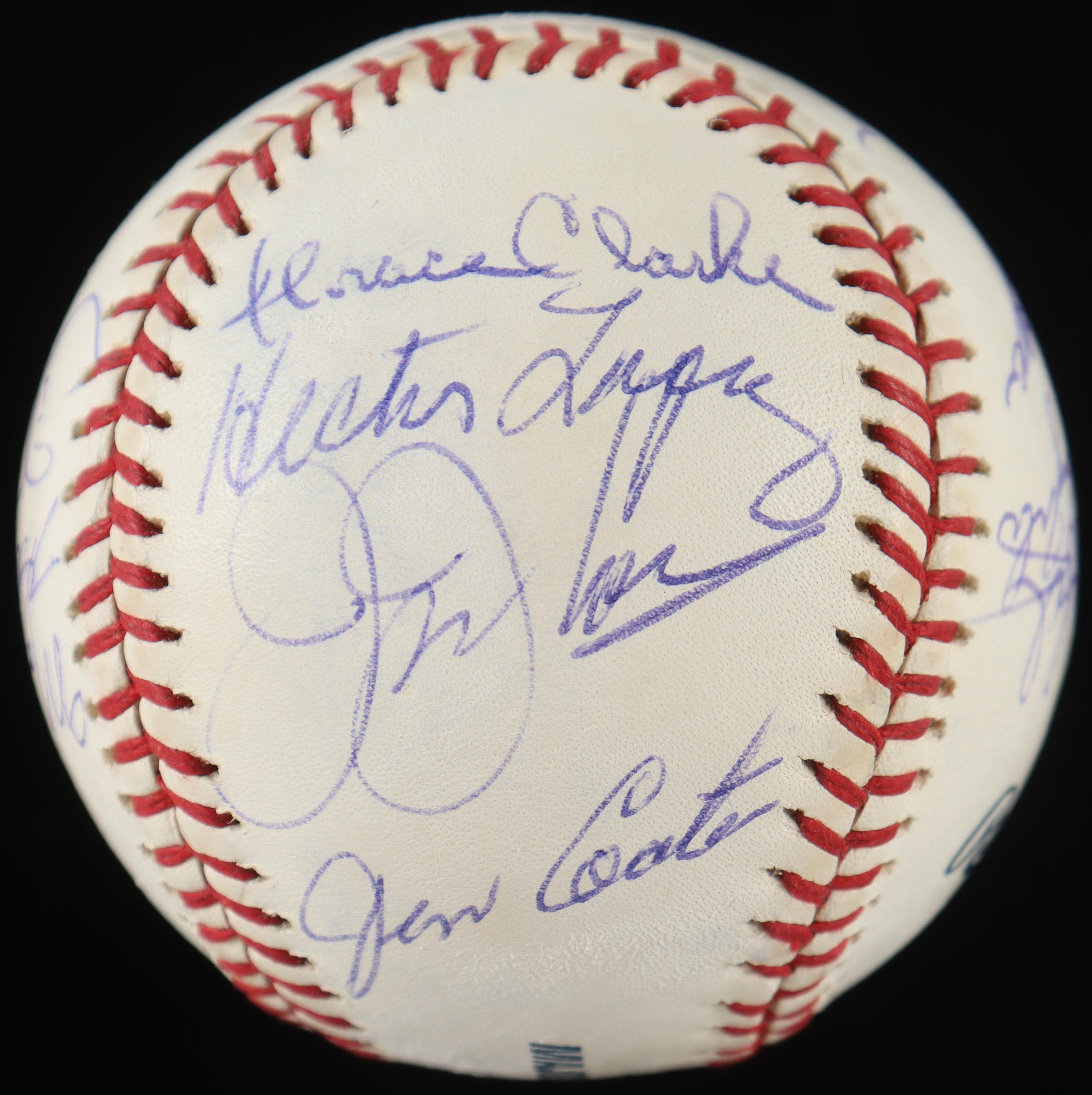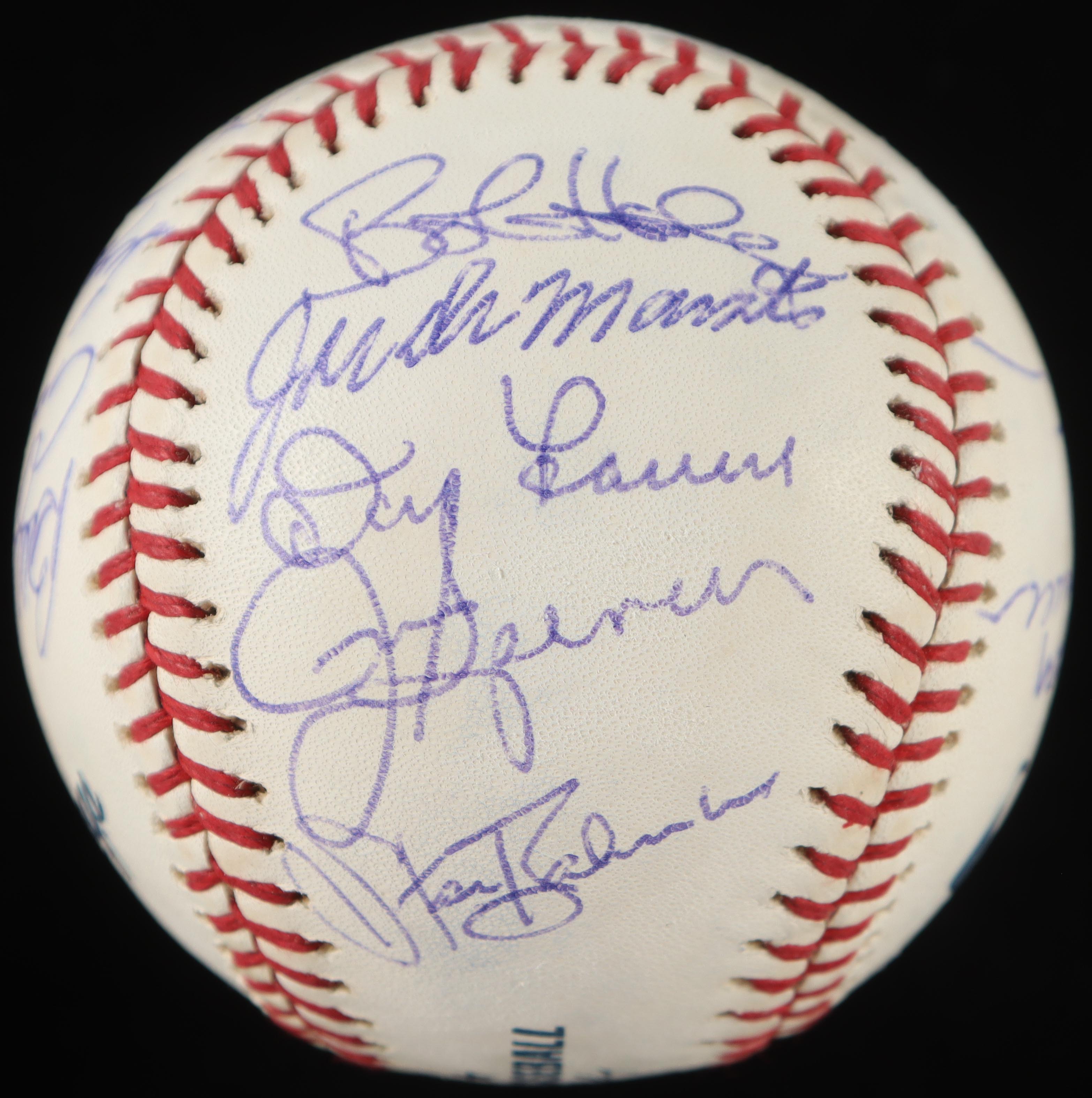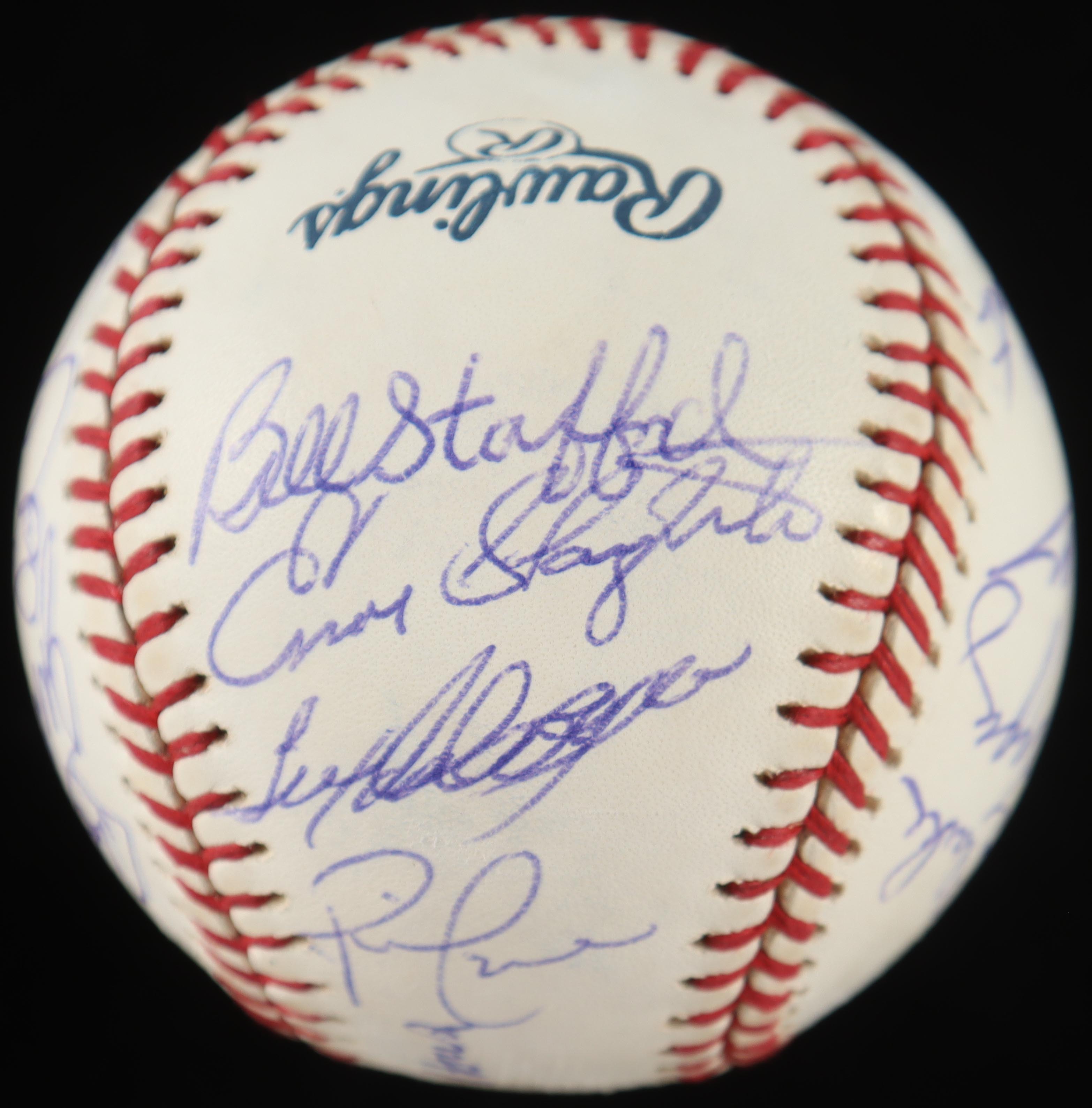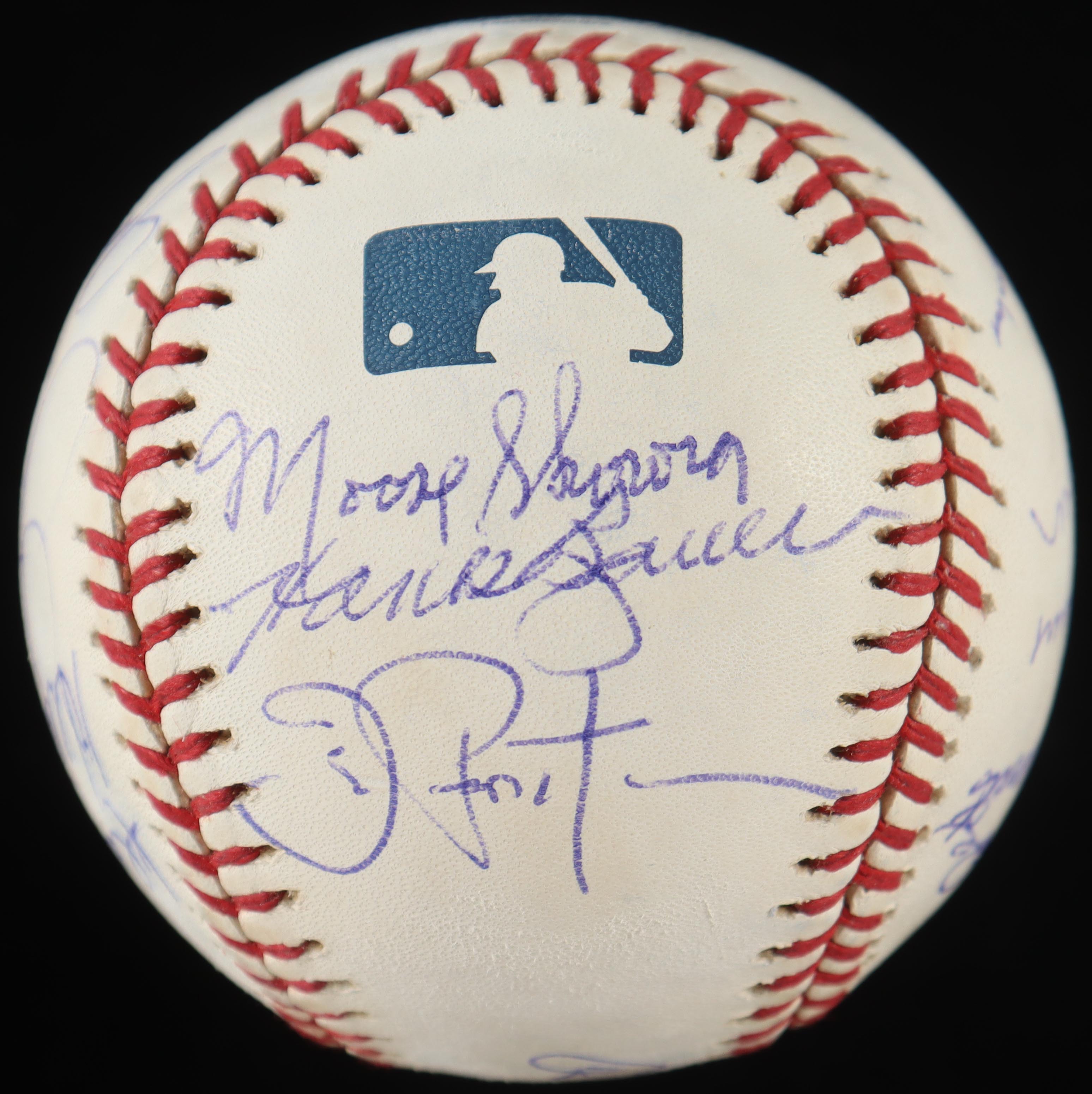 Rawlings Official Major League baseball has been hand-signed by (17) with Enos Slaughter, Don Larsen, Hank Bauer, Bill Skowron, Hector Lopez, Jim Spencer, Jay Johnstone, Joe Pepitone, Ralph Houk and (8) others. Display case is included as shown. Please note, the baseball is naturally toned.