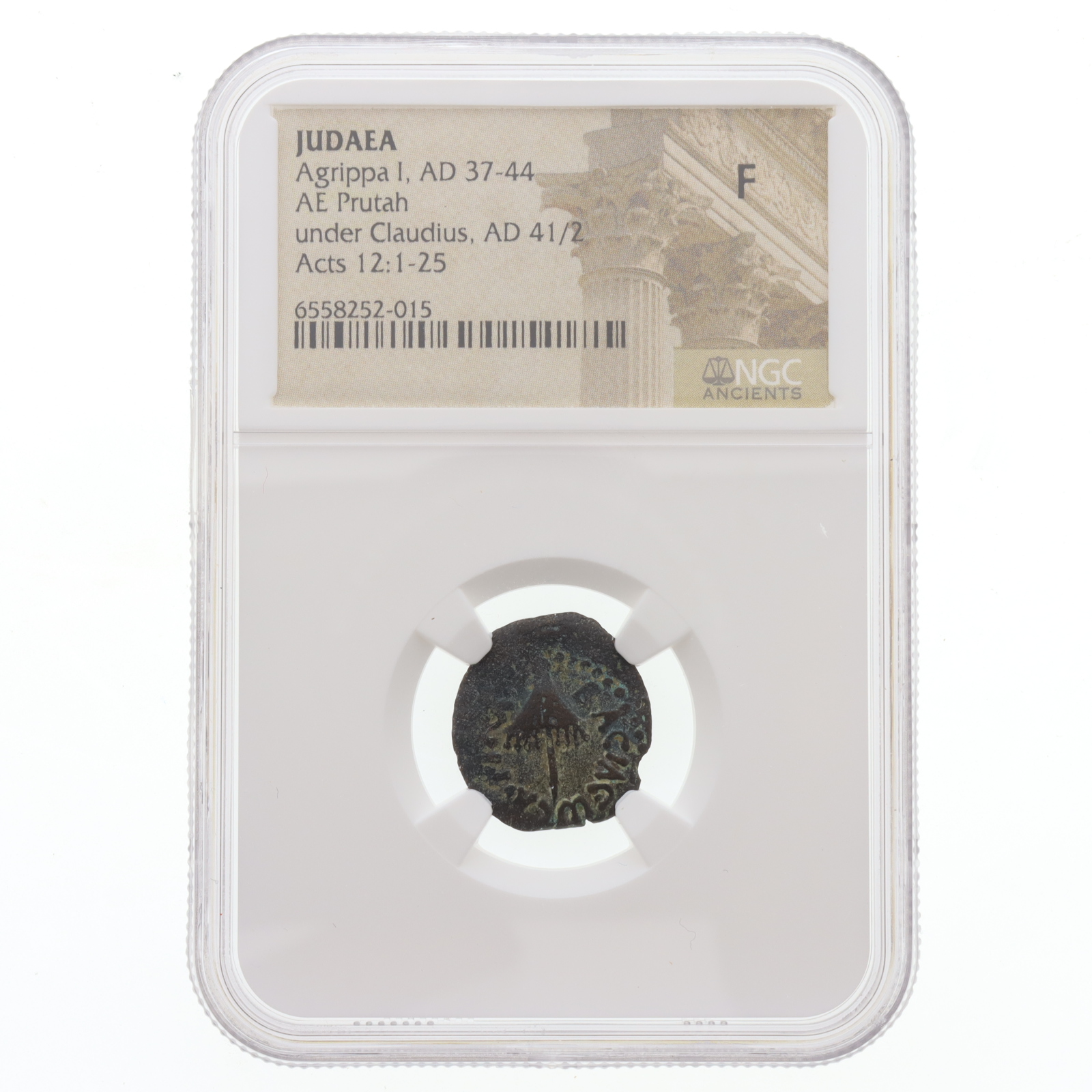 Judaea - Agrippa I, AD 37-44, AE Prutah, under Cladius, AD 41-42, Obverse Canopy Reverse Barley Ears (NGC VG)
