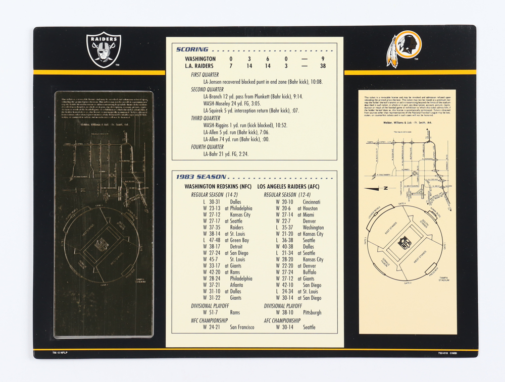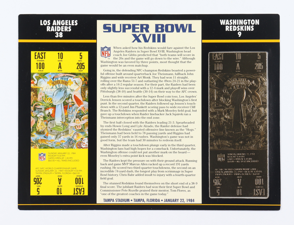 Super Bowl XVIII Commemorative 9x12 Score Card Display with 23kt Gold Ticket