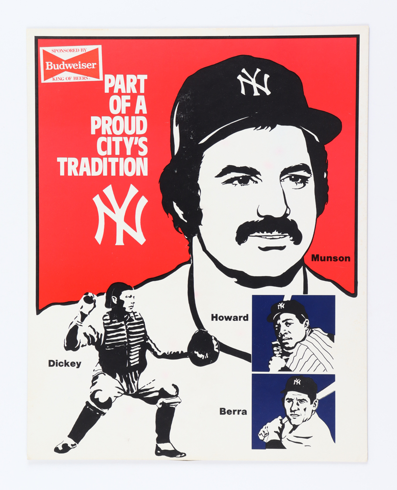 Vintage 1970s Yankees Budweiser Heavy Cardboard Counter Stand-Up Sign with Yogi Berra & Thurman Munson