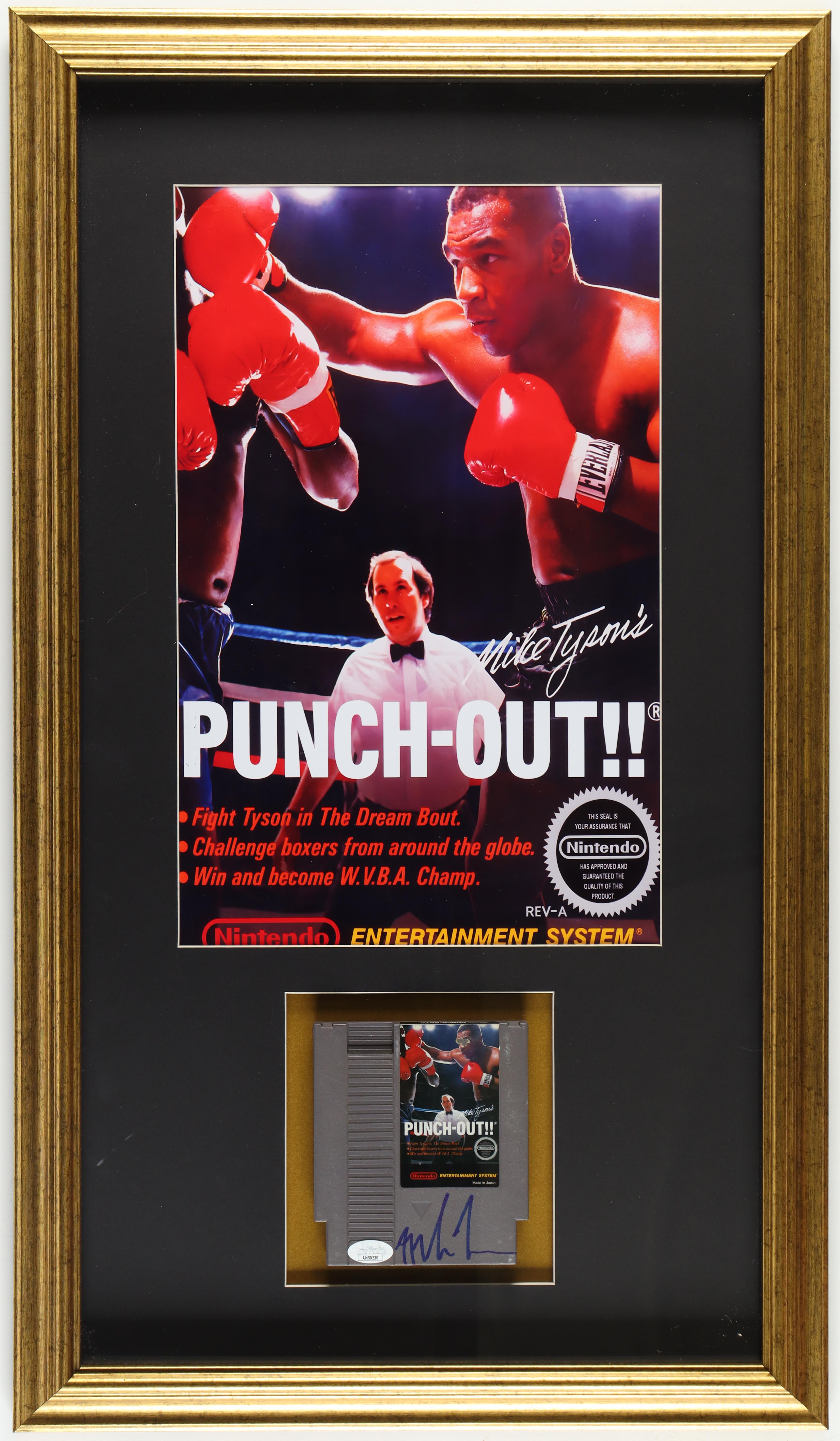 Custom frame measures 18" x 31" in size and features a "Punch-Out!!" video game cartridge that has been hand-signed by Mike Tyson (HOF).