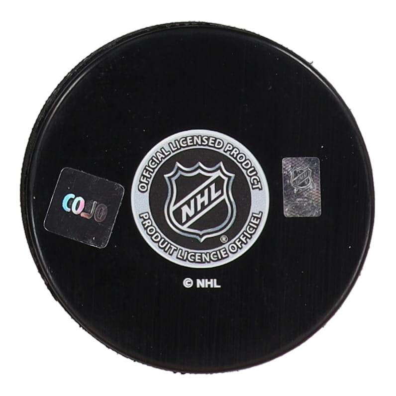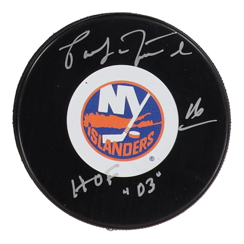 New York Islanders logo hockey puck has been hand-signed and inscribed by Pat LaFontaine (HOF)