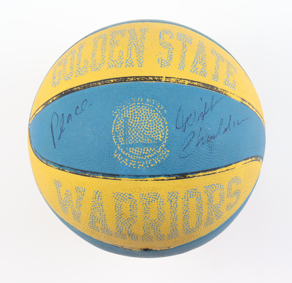 Golden State Warriors logo basketball. Hand-signed and inscribed by Wilt Chamberlain (D. 1999, HOF). Please note, the signature is faded and the basketball shows wear due to aging.