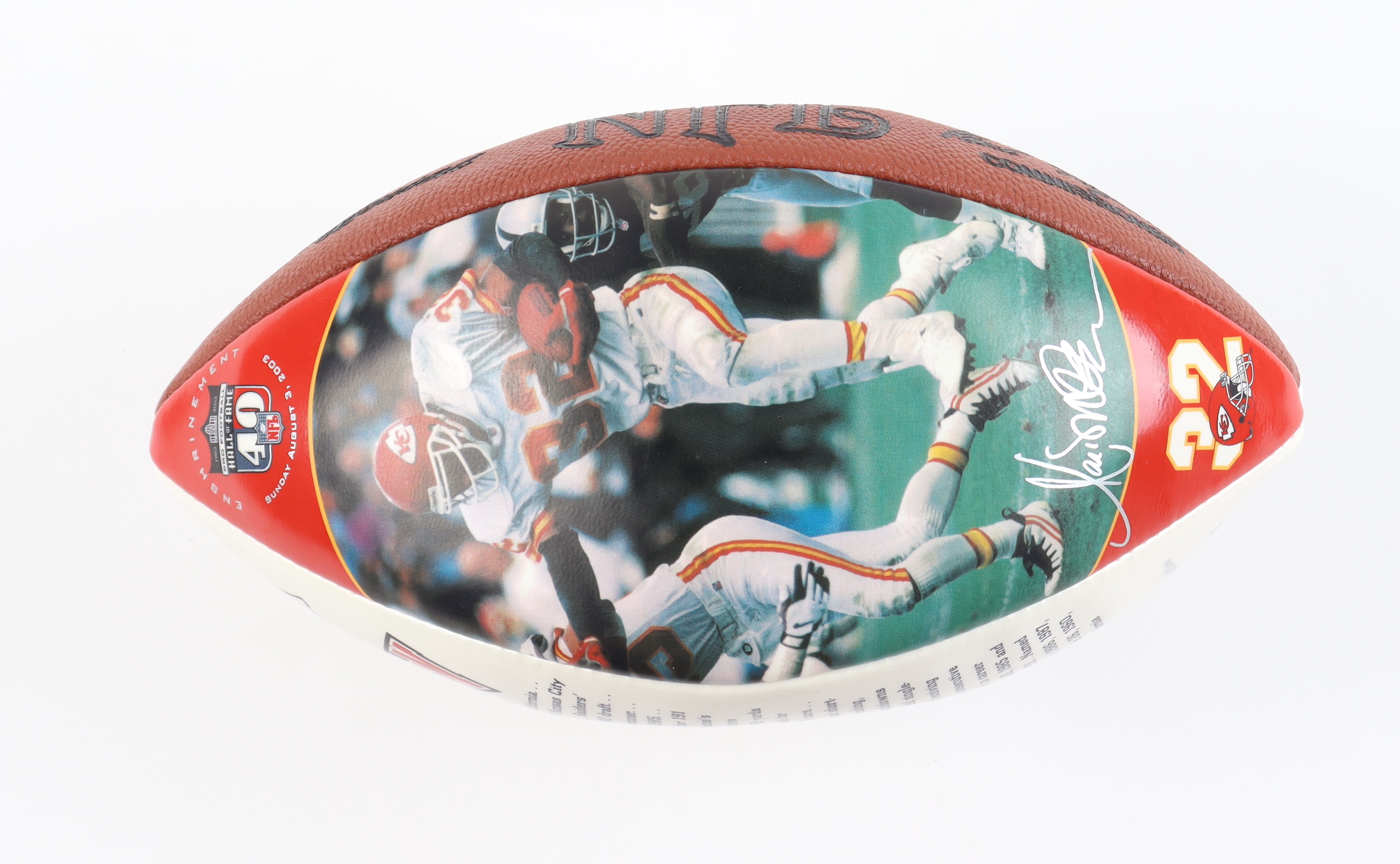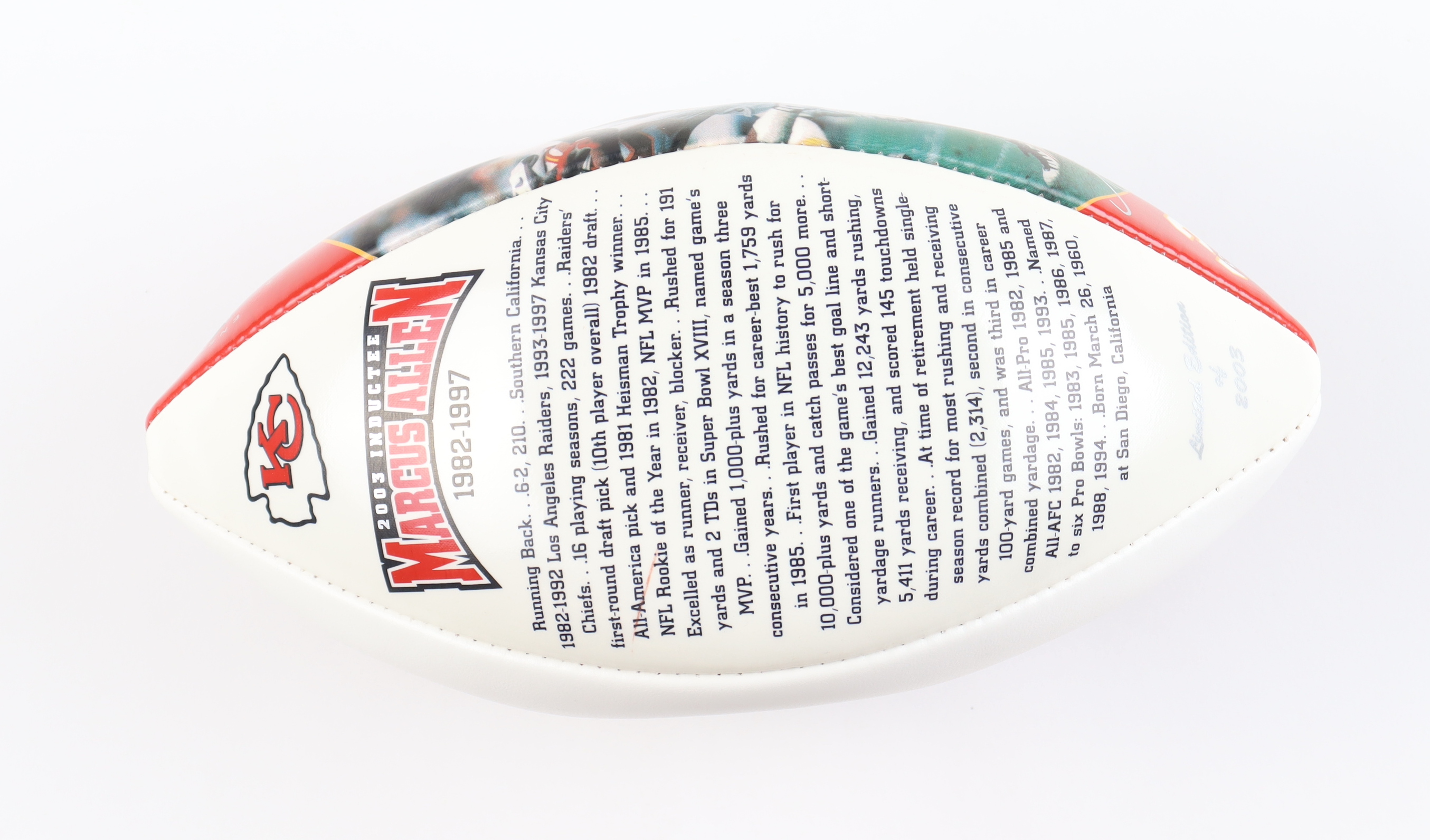 Wilson Official NFL Kansas City Chiefs Hall of Fame Commemorative logo football featuring Marcus Allen (HOF). Please note, the signature on the football is a facsimile.