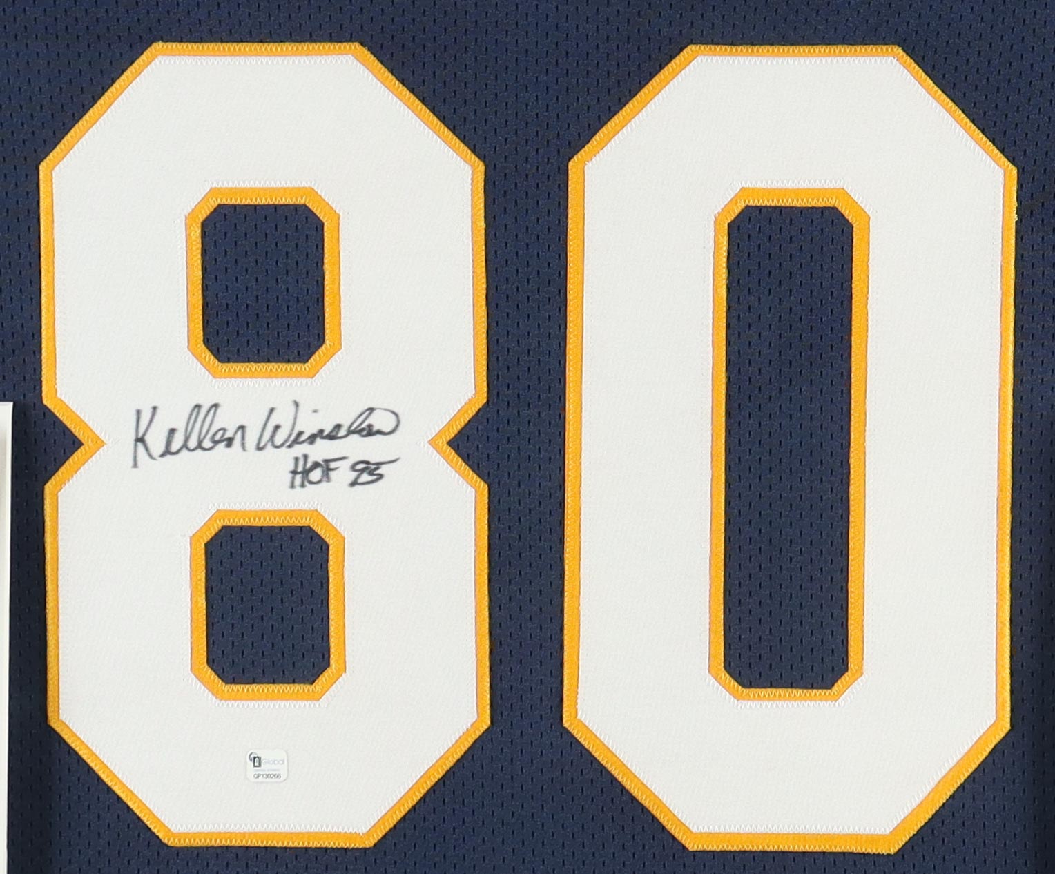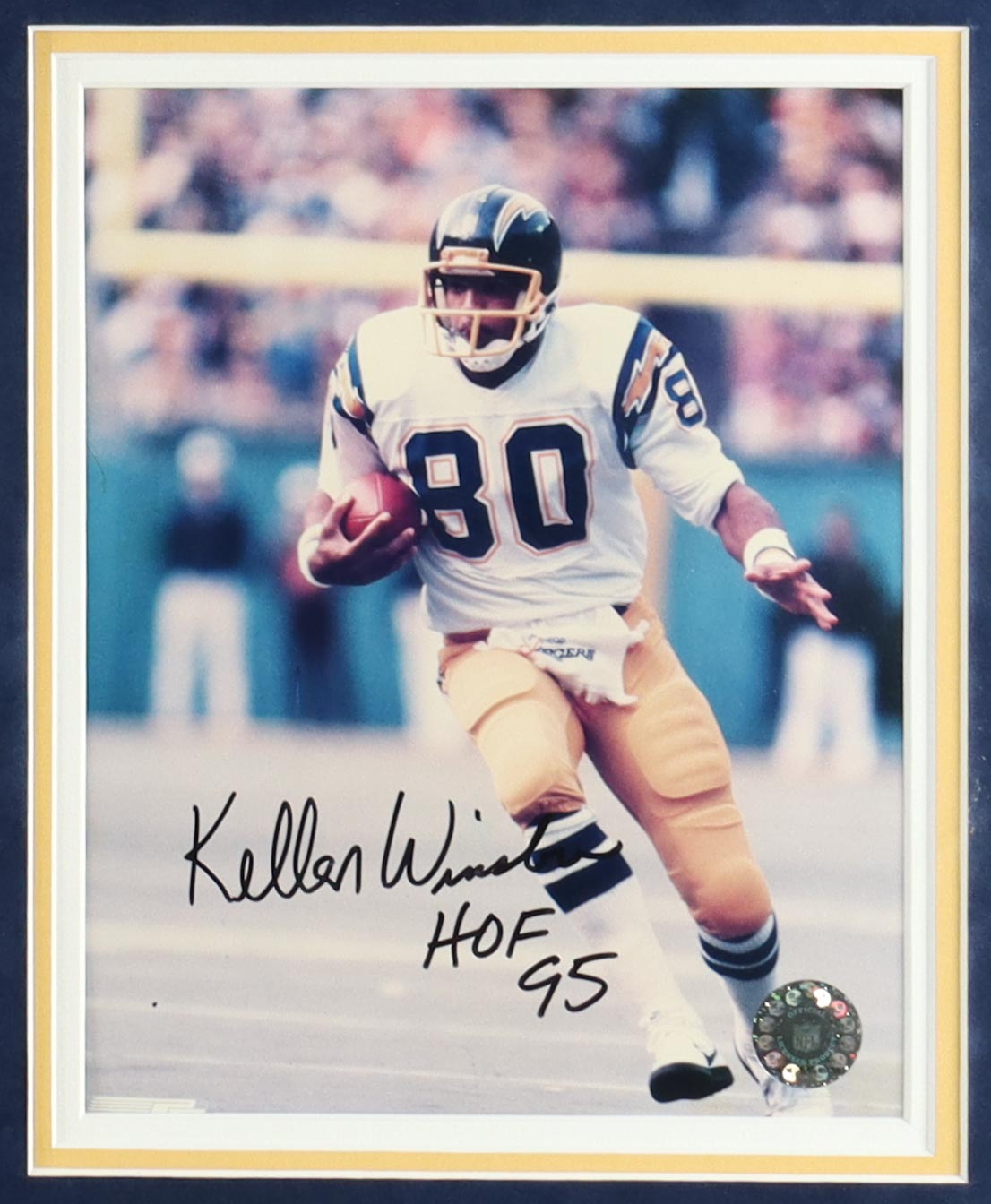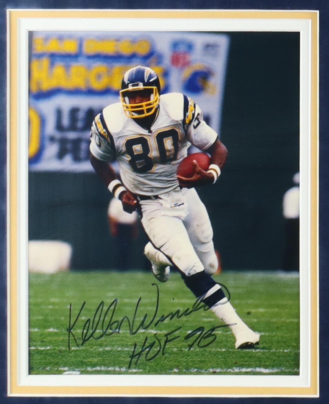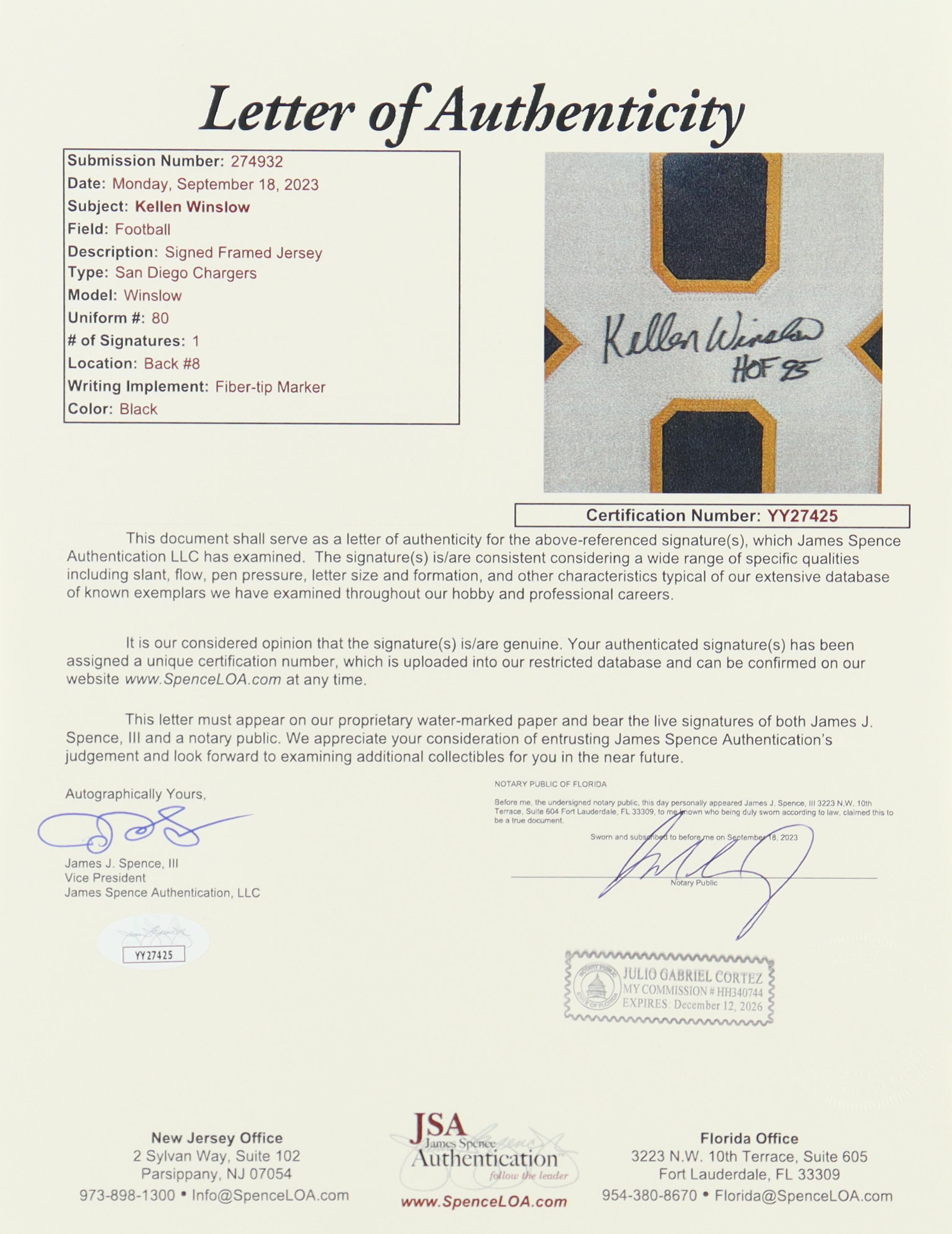 Custom frame measures 36.5" x 44.5" in size and features a jersey as well as (2) photos that have been hand-signed and inscribed by Kellen Winslow (HOF). Please note, there is scuffing, scratches as well as edge and corner wear and separation on the frame.