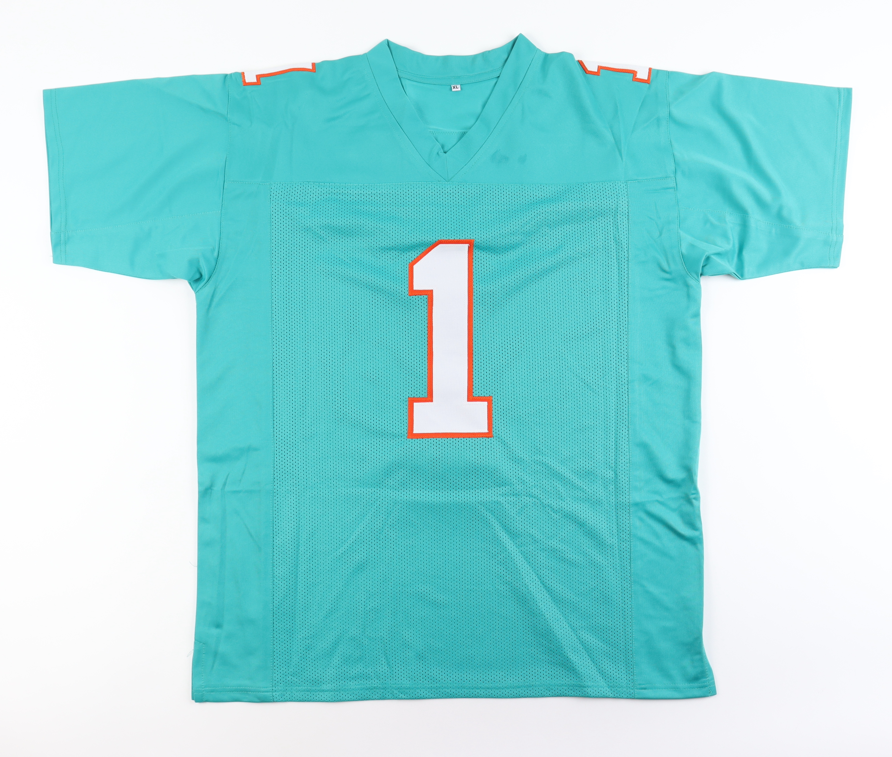 Custom jersey with everything sewn on, size XL. Hand-signed by Tua Tagovailoa. Please note, the front of the jersey is stained.