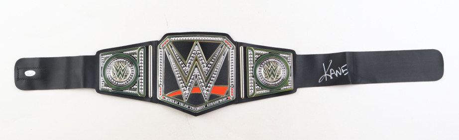 WWE plastic replica championship belt. Measures approximately 39" in length. Hand-signed by Kane (HOF).