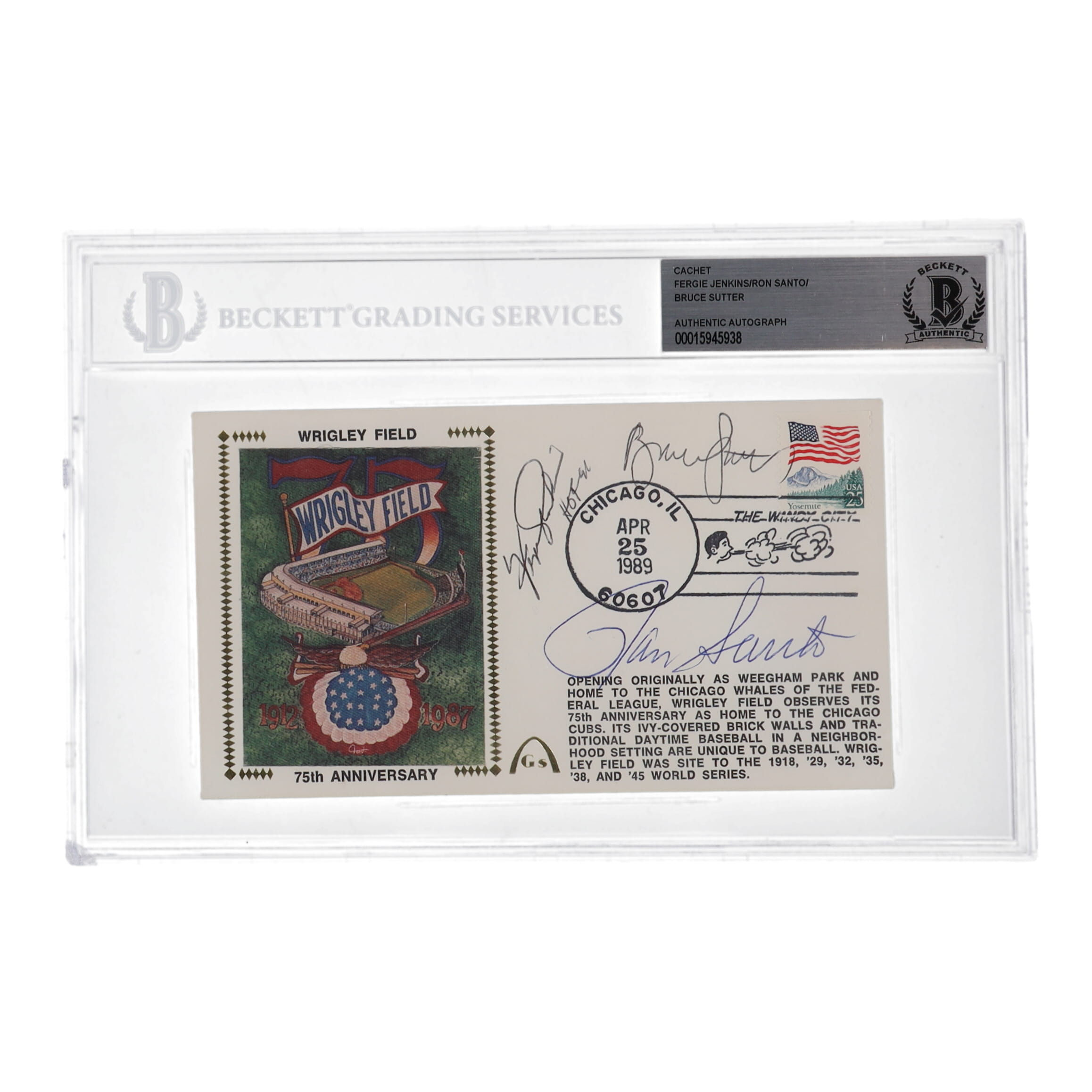 Wrigley Field 75th Anniversary Envelope measures 6" x 9" with encapsulation. Hand-signed by Fergie Jenkins (Chicago Cubs, HOF), Ron Santo (D.2010, Chicago Cubs, HOF), and Bruce Sutter (D. 2022, Chicago Cubs, HOF).