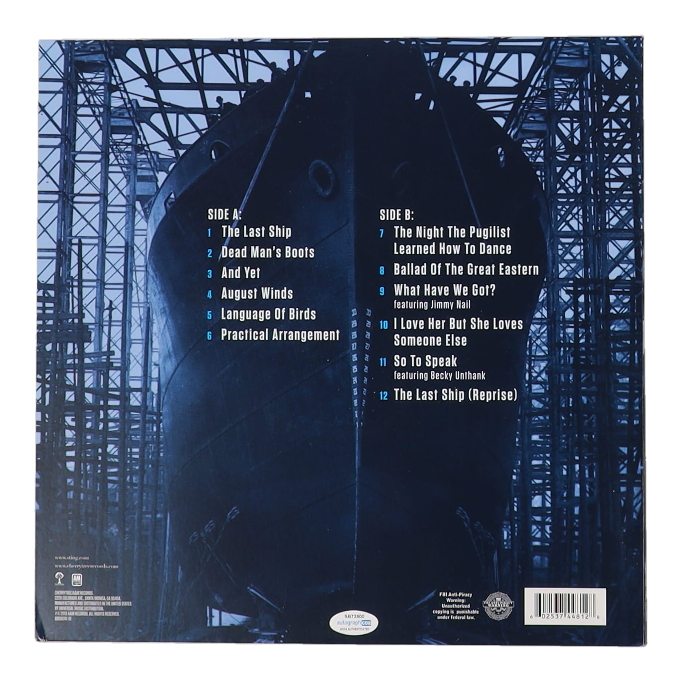 Sting Signed "The Last Ship" Vinyl Record Album Sleeve (ACOA)