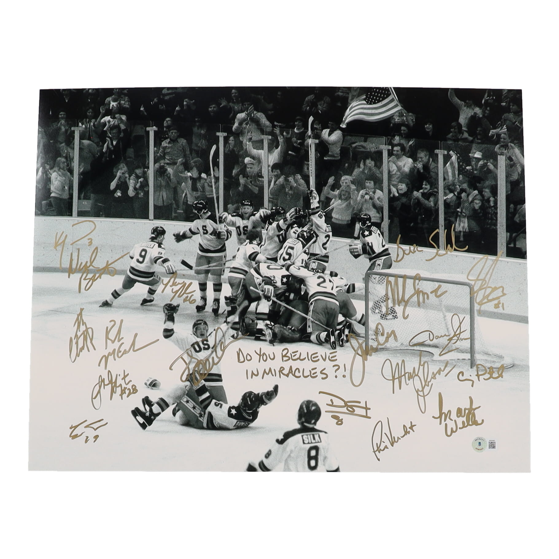 Photo measures 16" x 20" in size and has been hand-signed and inscribed by (18) members of the 1980 "Miracle on Ice" Team USA hockey team. Signers include Neal Broten, Dave Silk, Rob McClanahan, Mark Johnson, Steve Janaszak, Bill Baker, Dave Christian, Ken Morrow, Jack O'Callahan, Steve Christoff, Mike Eruzione, Buzz Schneider, Eric Stroebel, Phil Verchota, Mark Wells, Craig Patrick, John Harrington & Jim Craig