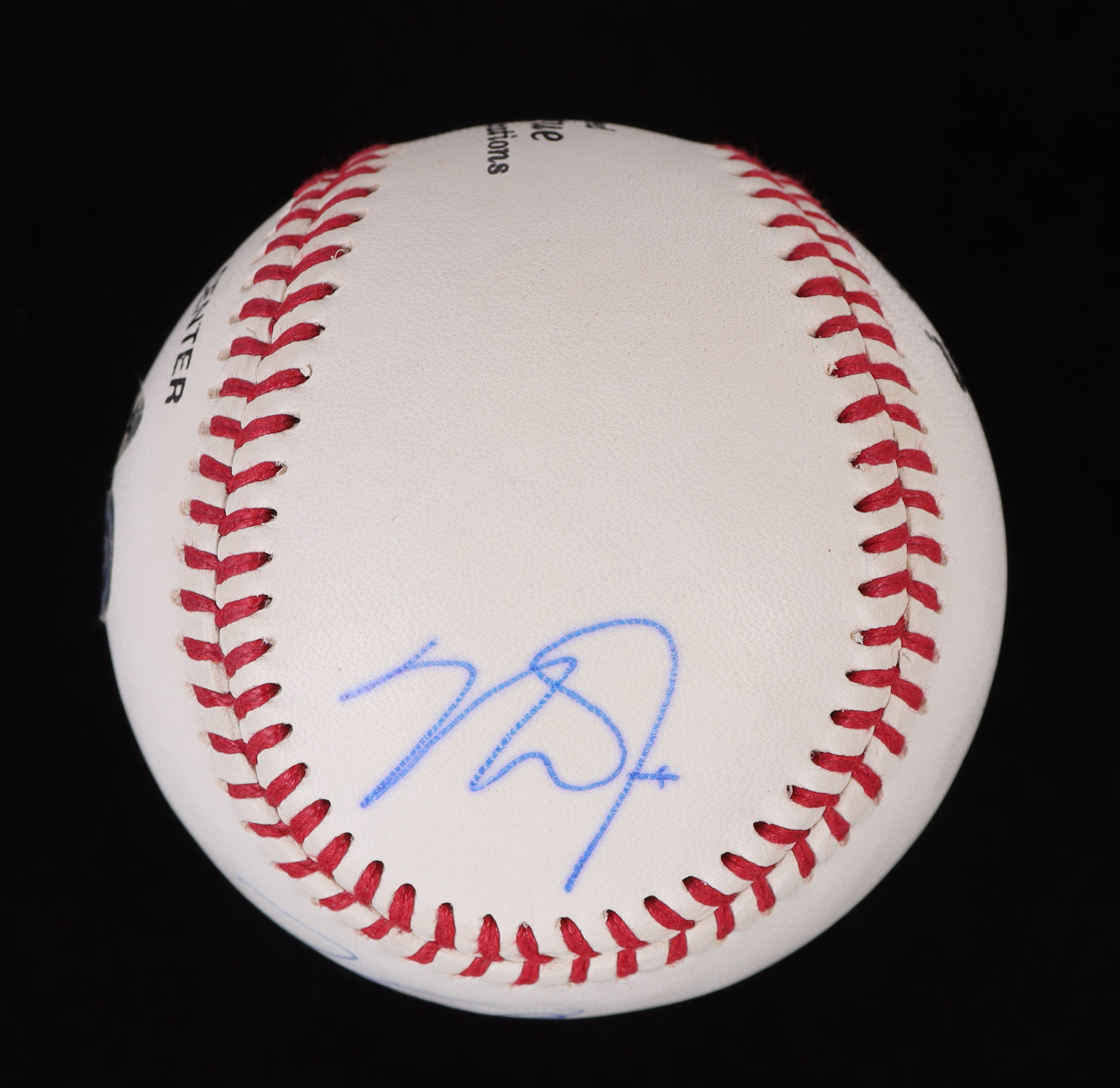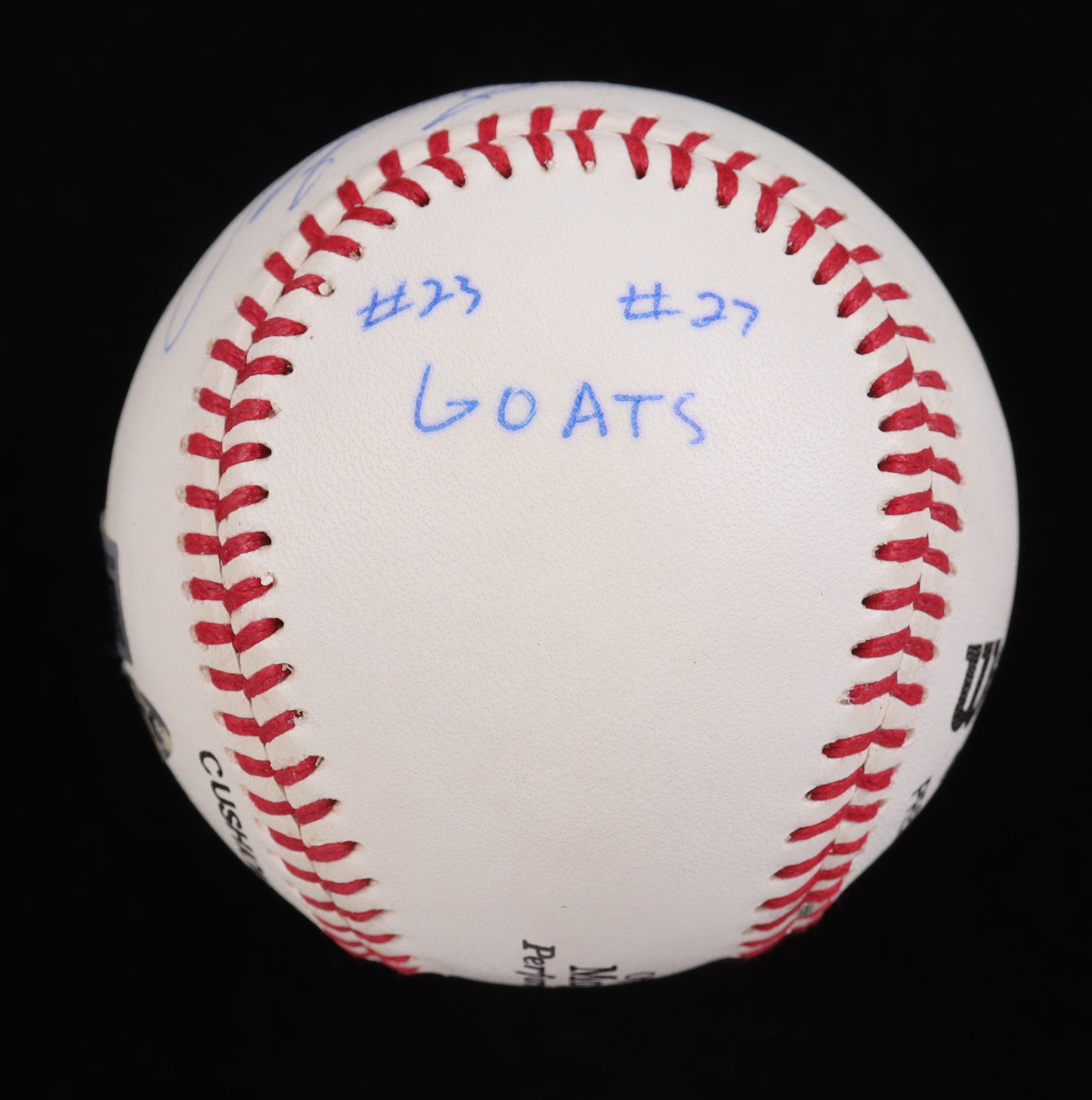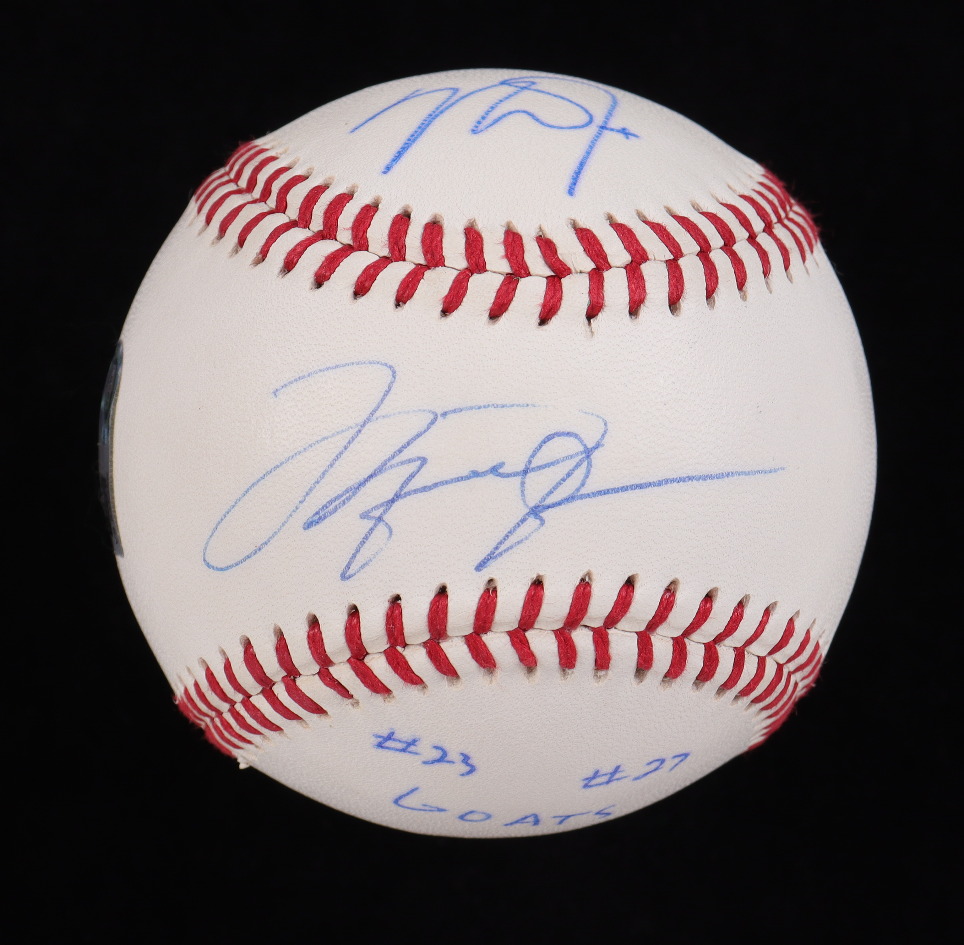 Baseball has been hand-signed by both Michael Jordan (Chicago Bulls, HOF) and Mike Trout (Los Angeles Angels). Mike Trout inscribed the baseball with "#23 #27 GOATS".