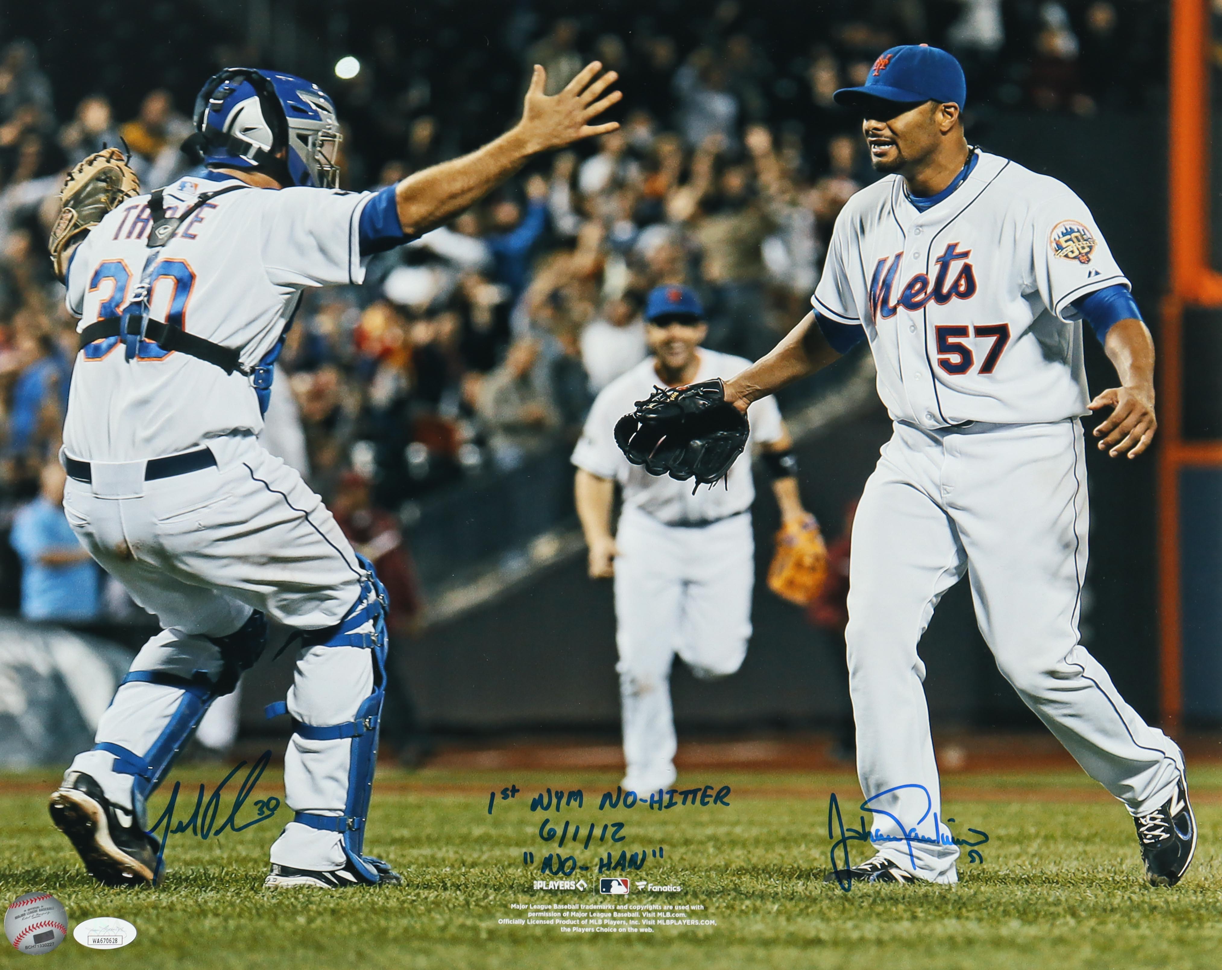 Photo measures 16" x 20" in size and has been hand signed and inscribed by Johan Santana and Josh Thole (New York Mets).
