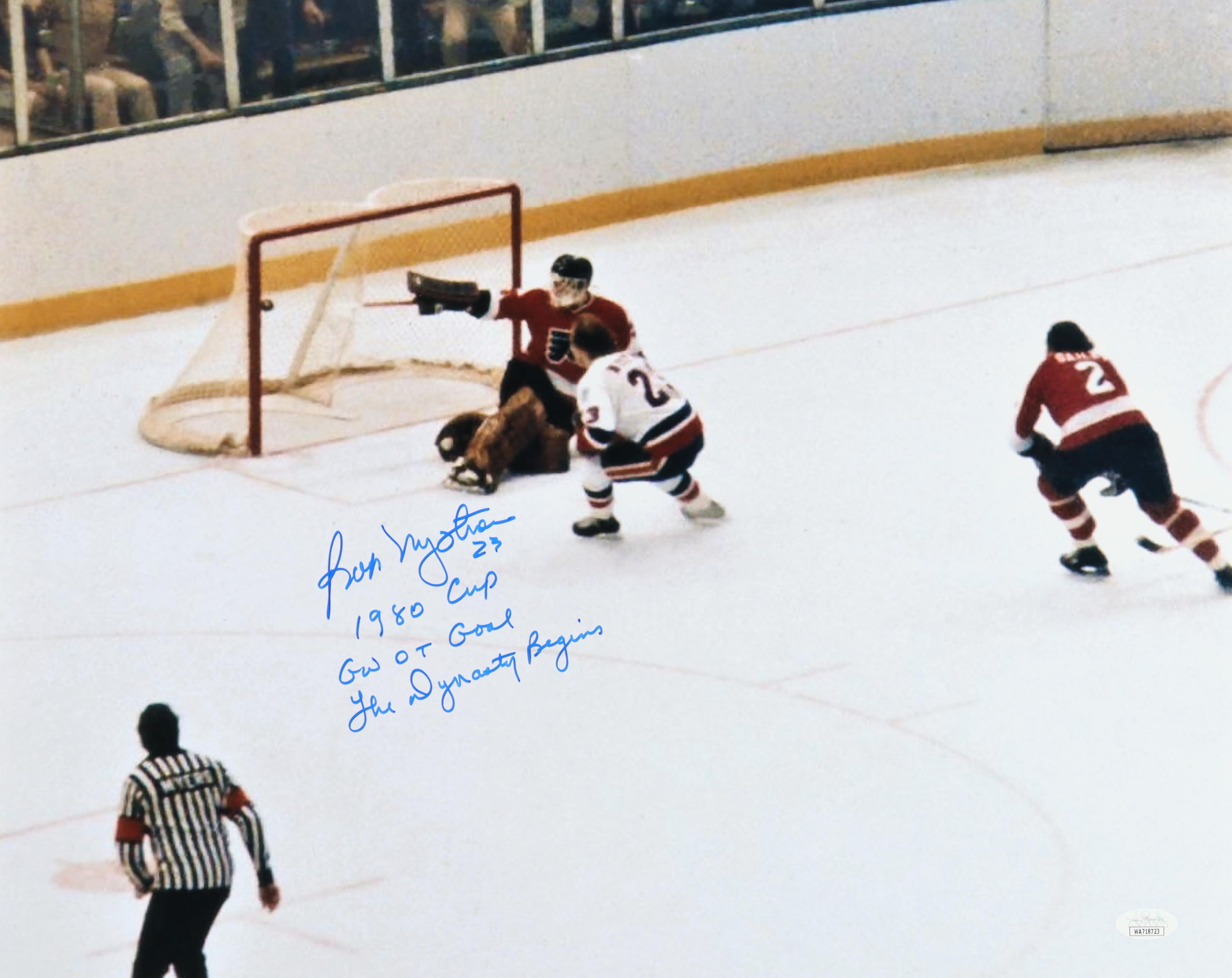 Photo measures 16" x 20" in size and has been hand-signed and inscribed by Bob Nystrom (New York Islanders).