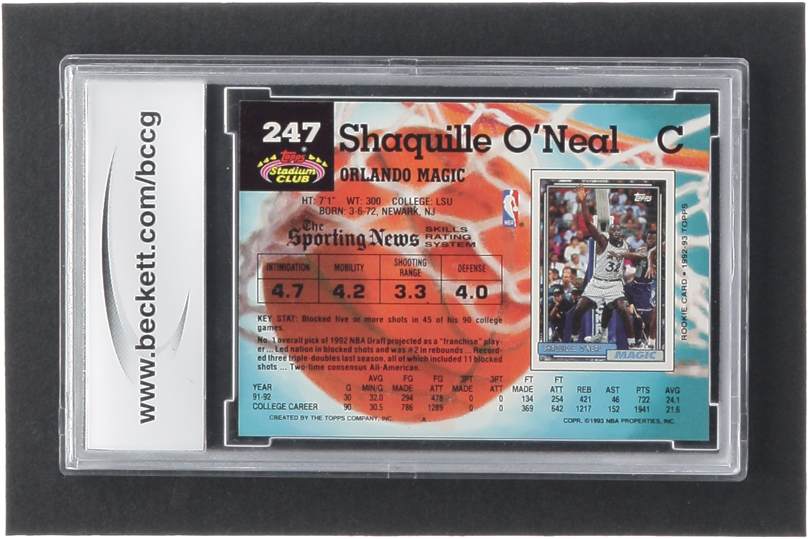 Shaquille O'Neal 1992-93 Stadium Club #247 RC (BCCG 10)