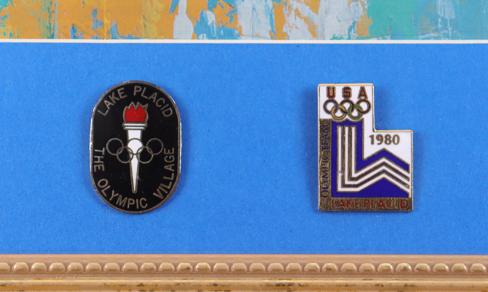 1980 US Olympic Hockey Team "Miracle on Ice" Custom Framed Leroy Neiman Vintage Print Display with 1980 Lake Placid Pins