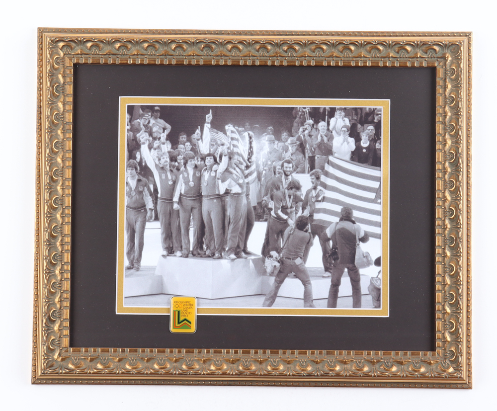 Custom frame measures approximately 13.5" x 16.5" in size and features a photo of "The Miracle on Ice" Olympic team as well as a 1980 Vintage Olympic Pin. Please note, the display is unsigned.