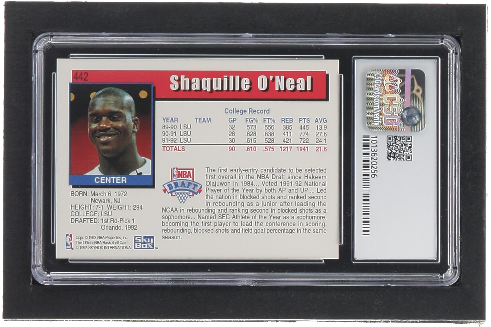 Shaquille O'Neal 1992-93 Hoops #442 RC (CSG 8)