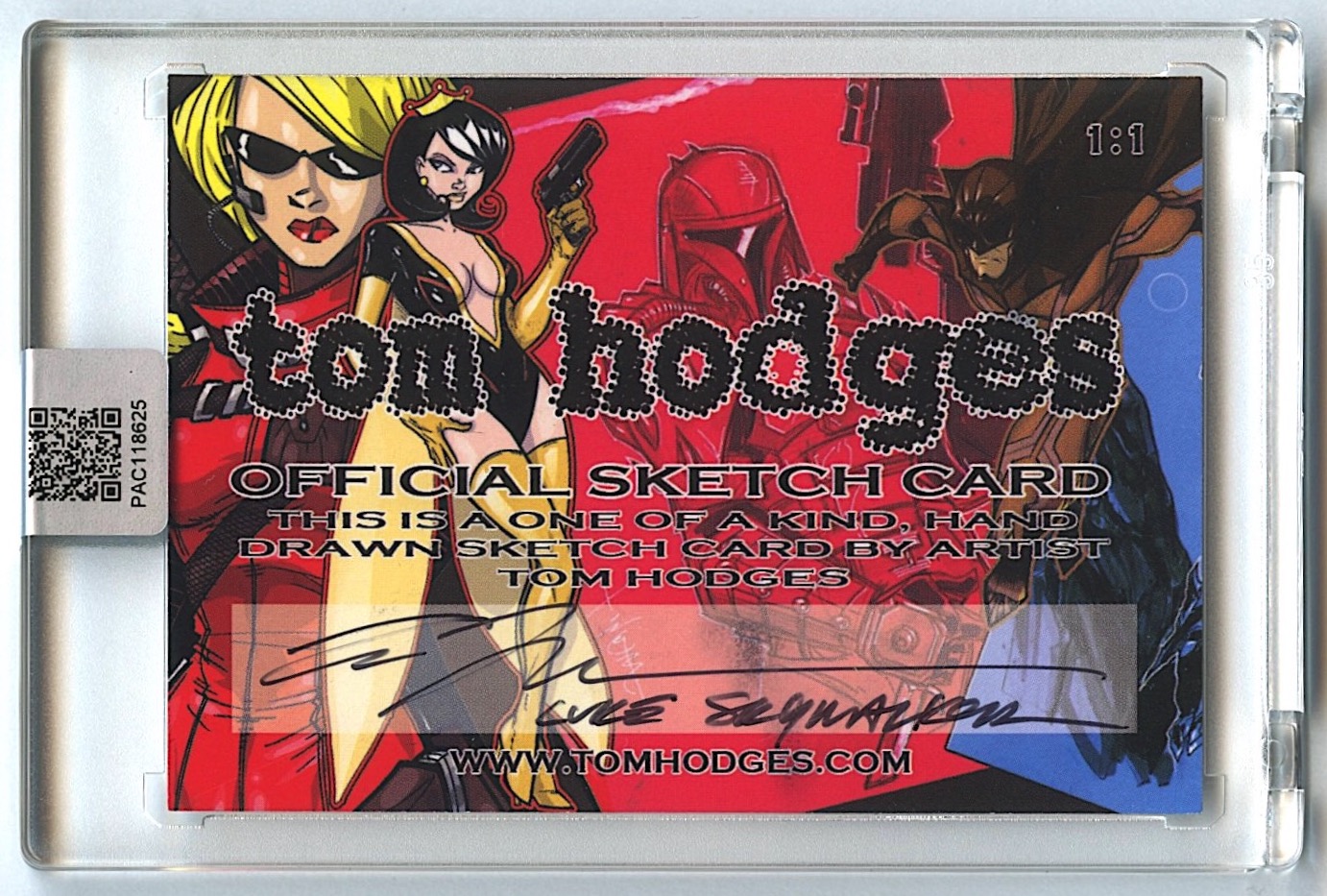 This original sketch card includes original art by renowned comic book artist, Tom Hodges. Also includes a character name inscription on the back by the artist.