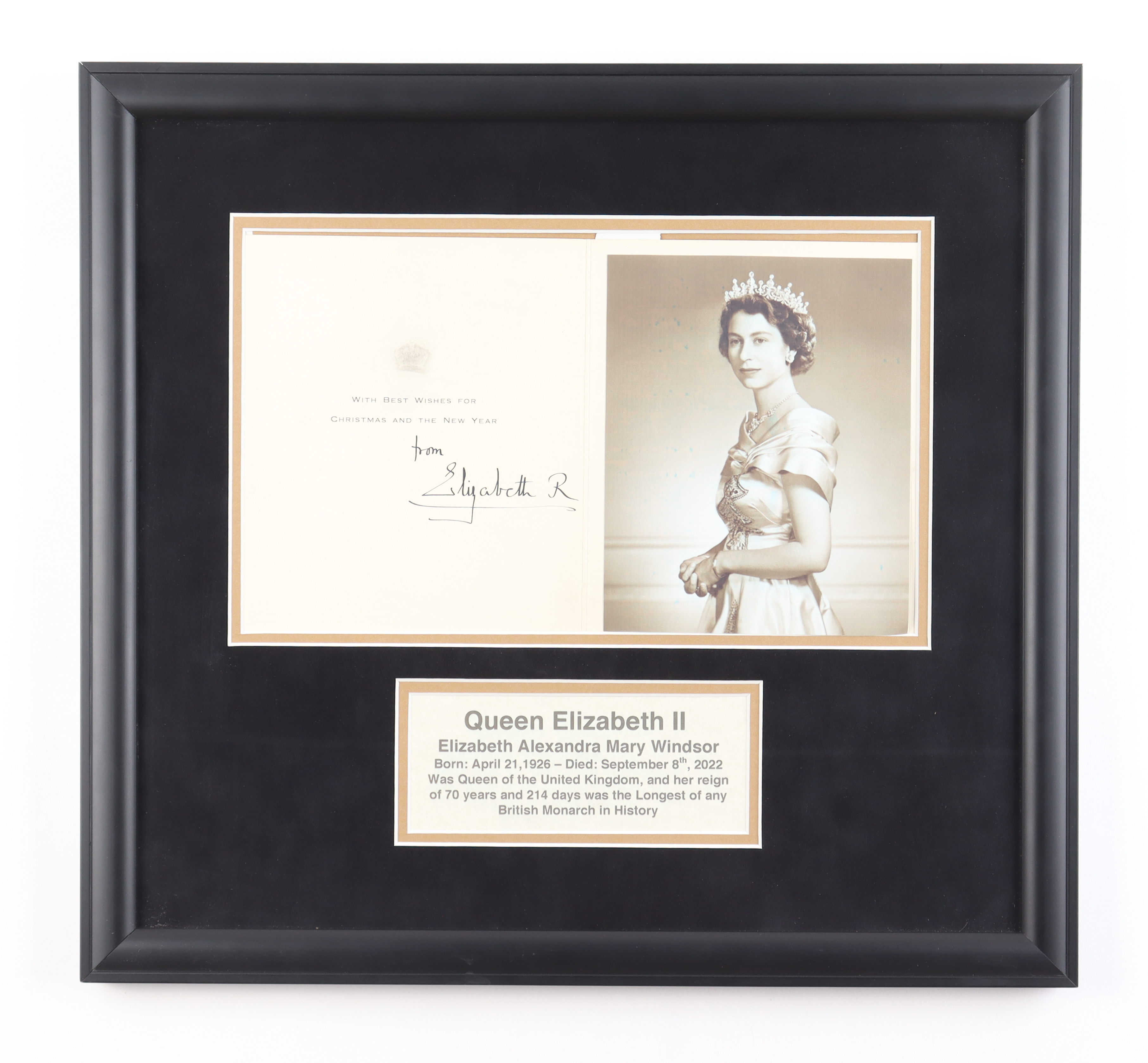 Custom frame measures 18" x 19" in size and features a personalized holiday card that has been hand-signed by Queen Elizabeth II (D. 2022). Queen Elizabeth II inscribed the gift card "From".