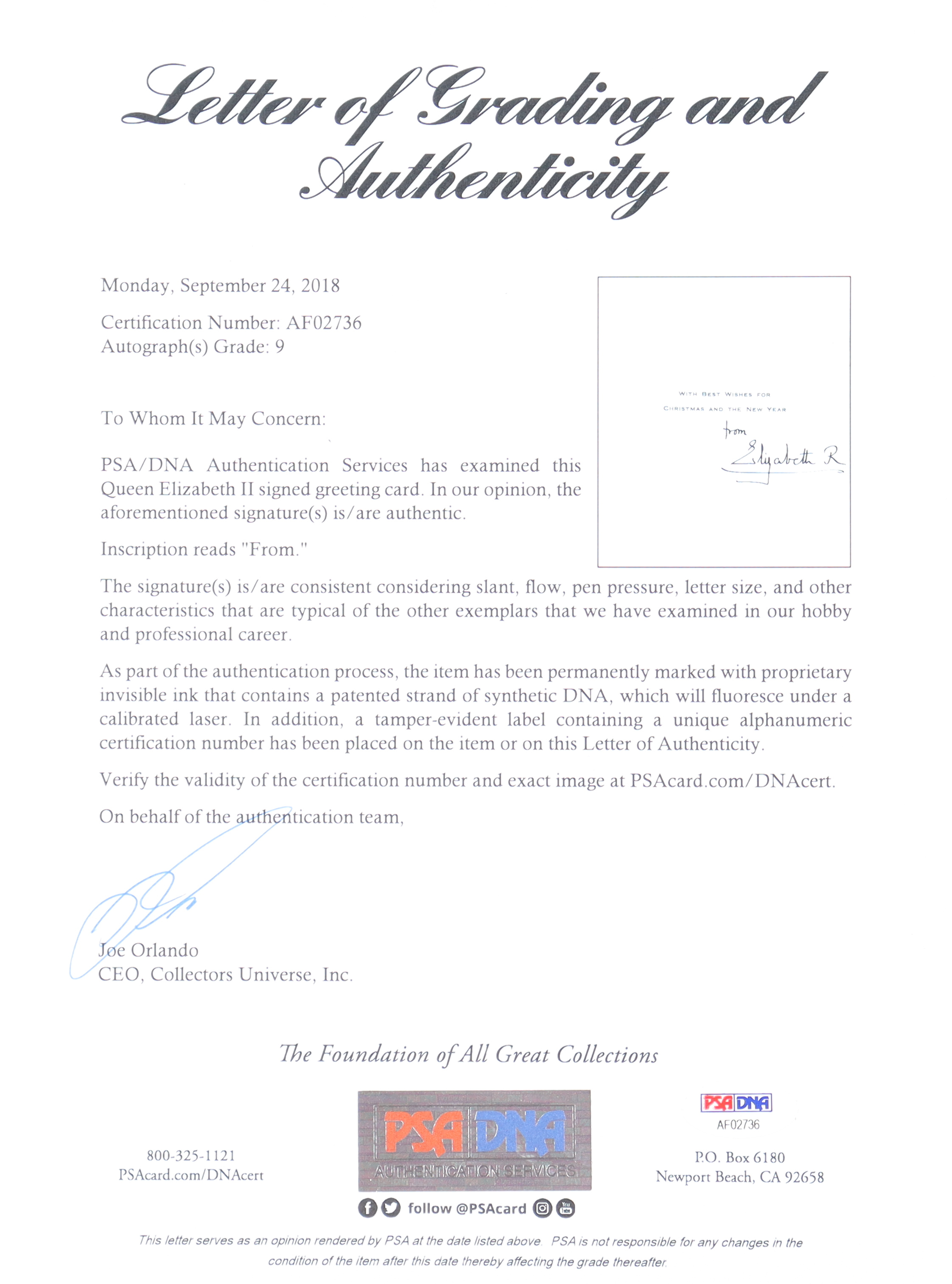 The autograph includes an official PSA/DNA hologram and matching LOA for authenticity purposes.