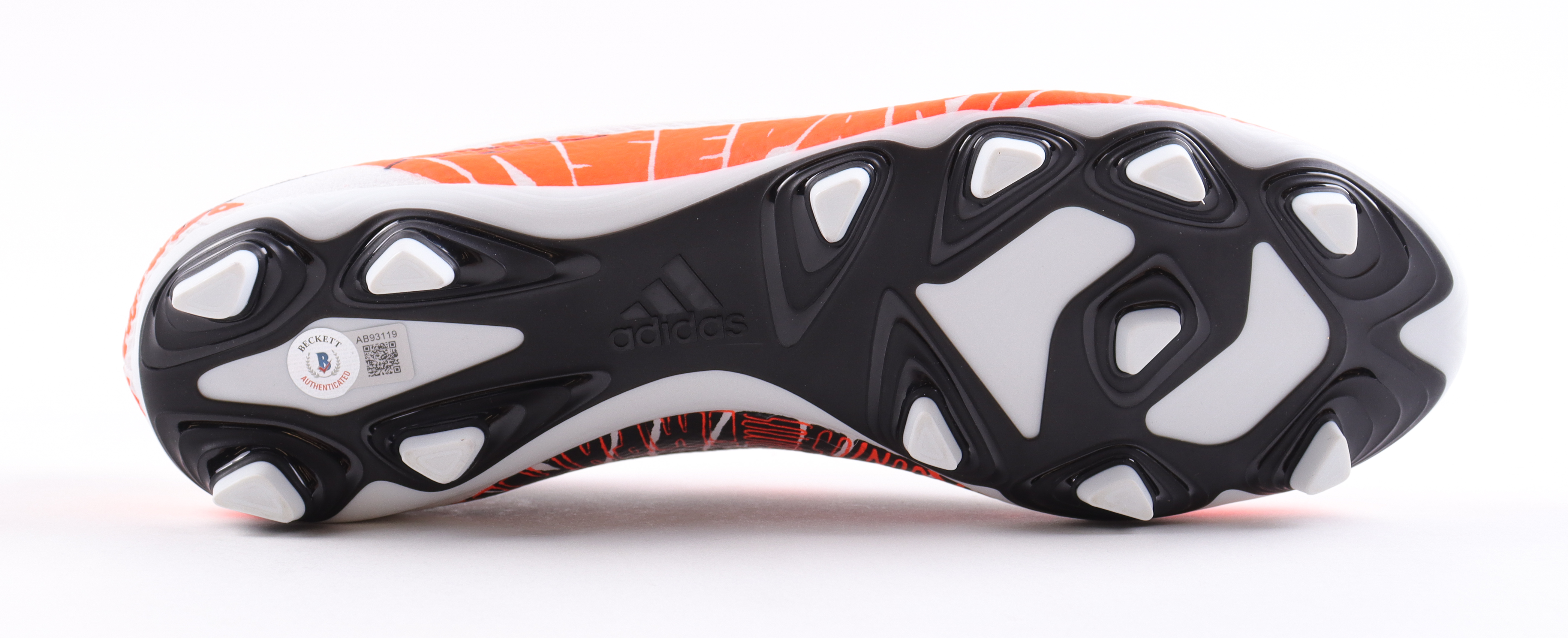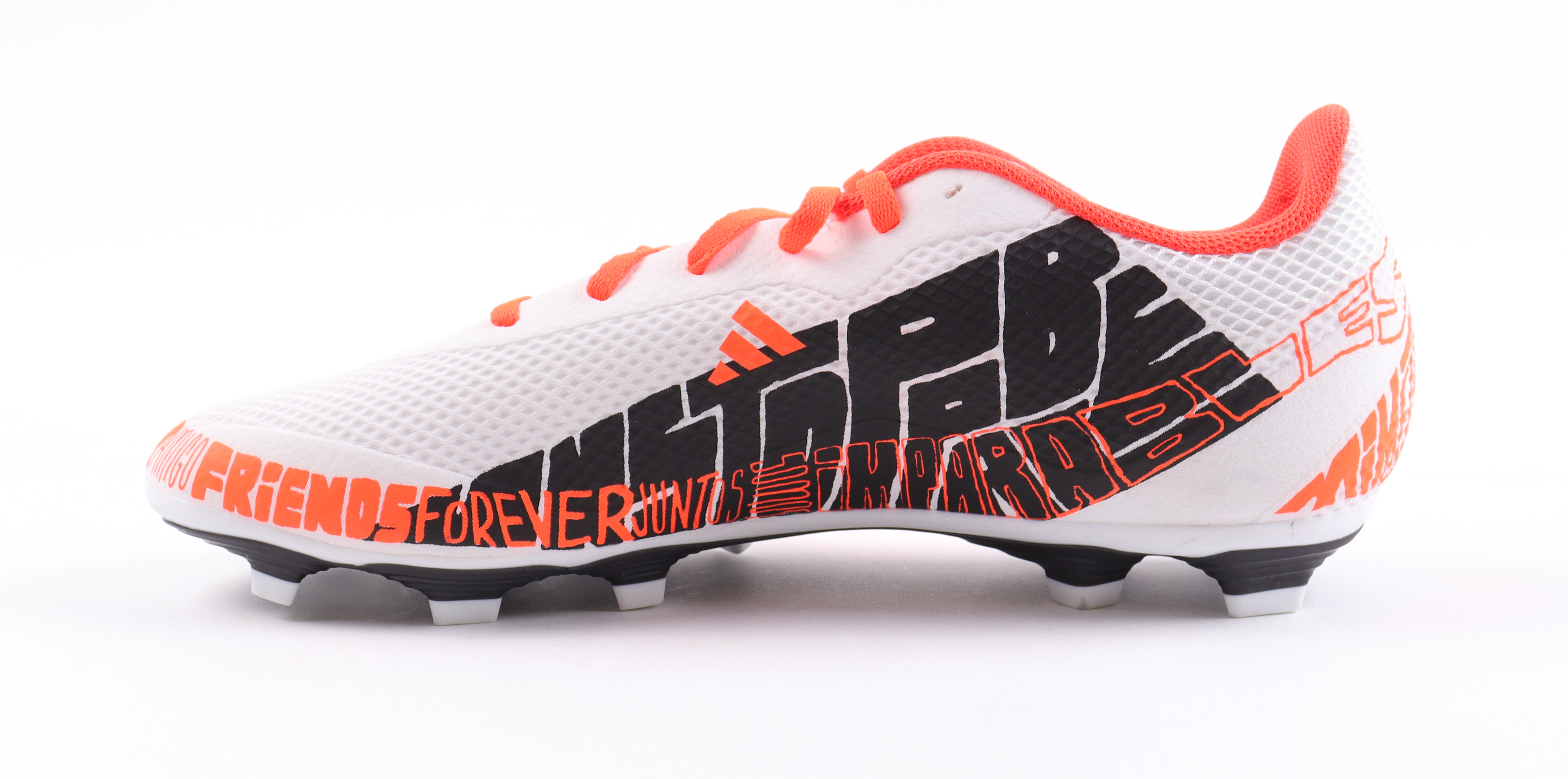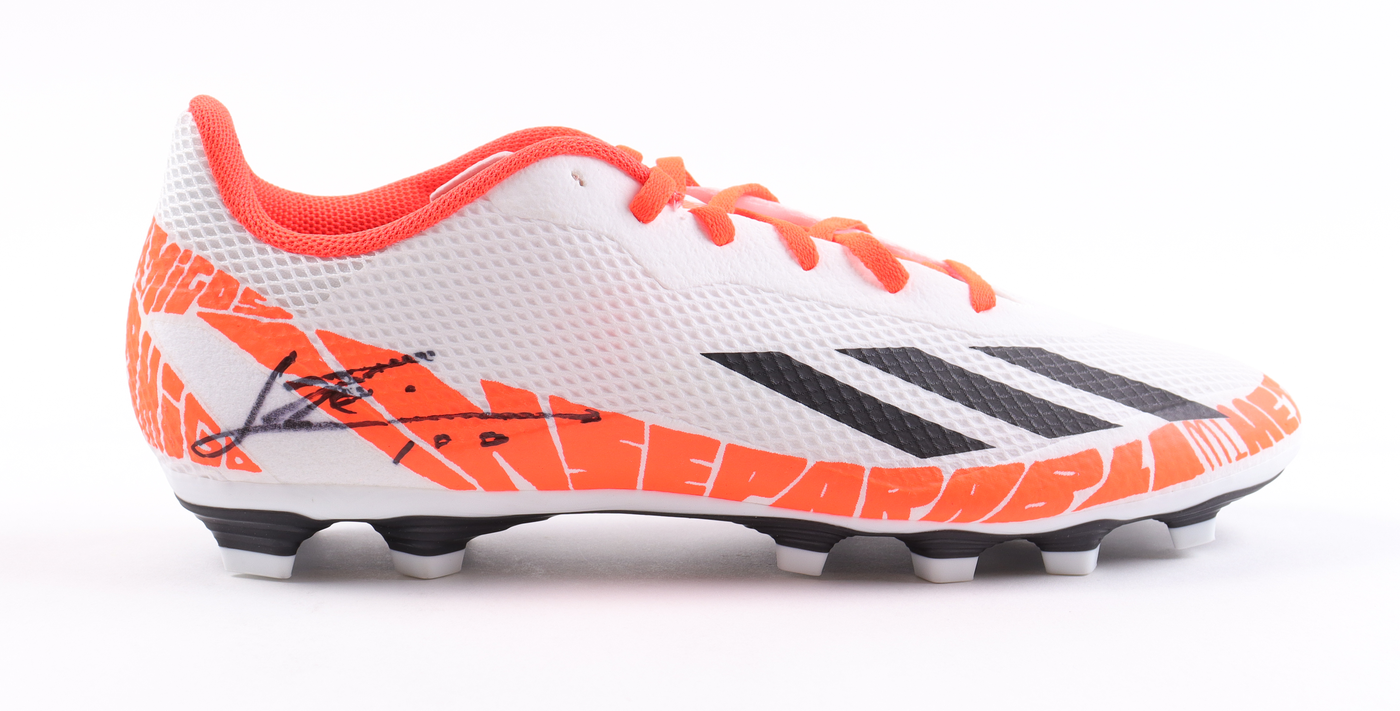 Adidas soccer cleat, size 10.5. Hand-signed and inscribed by Lionel Messi (Argentina National Team).